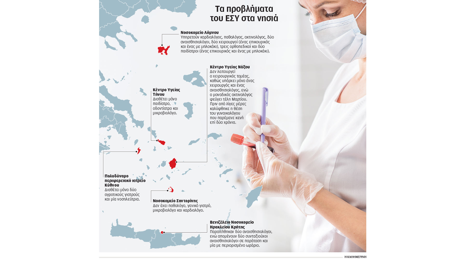 Στις Κυκλάδες η υποστελέχωση είναι εκκωφαντική. Στο Κέντρο Υγείας Τήνου, το οποίο καλείται να εξυπηρετήσει τον χειμώνα 10.000 μόνιμους κατοίκους και το καλοκαίρι πολύ μεγαλύτερο αριθμό τουριστών, έχουν απομείνει τρεις γιατροί – παιδίατρος, μικροβιολόγος και οδοντίατρος. Στη Νάξο το Κέντρο Υγείας διαθέτει έναν αναισθησιολόγο και έναν χειρουργό, συνεπώς ο χειρουργικός τομέας είναι εκτός λειτουργίας. Ενας ακτινολόγος έχει αναλάβει τις διαγνωστικές εξετάσεις, ο οποίος στα τέλη Μαρτίου αποχωρεί. «Διαθέτουμε από έναν γιατρό σε πολλές ειδικότητες, όπως ΩΡΛ, οφθαλμίατρο, νεφρολόγο, καρδιολόγο, με συνέπεια η αναμονή για ραντεβού να είναι τόσο μεγάλη που εξωθούνται οι πολίτες στον ιδιώτη γιατρό», σχολιάζει η δημοσιογράφος και κάτοικος Νάξου Πόπη Αλιμπέρτη. «Πριν από λίγες ημέρες καλύφθηκε η επί δύο χρόνια ορφανή θέση του γυναικολόγου». Τα παράδοξα είναι πολλά, «διαθέτουμε αξονικό τομογράφο, ο οποίος είναι ανενεργός». Ο δήμος προσφέρει σε κάθε επικουρικό γιατρό 400 ευρώ μηνιαίως για να καλύψει ορισμένα από τα έξοδα της διαμονής στο νησί. Η μεγαλύτερη πληγή, ωστόσο, είναι τα πολυδύναμα περιφερειακά ιατρεία, τα οποία πρέπει να καλύπτουν τις ανάγκες των κατοίκων της ορεινής Νάξου αλλά και των Μικρών Κυκλάδων.