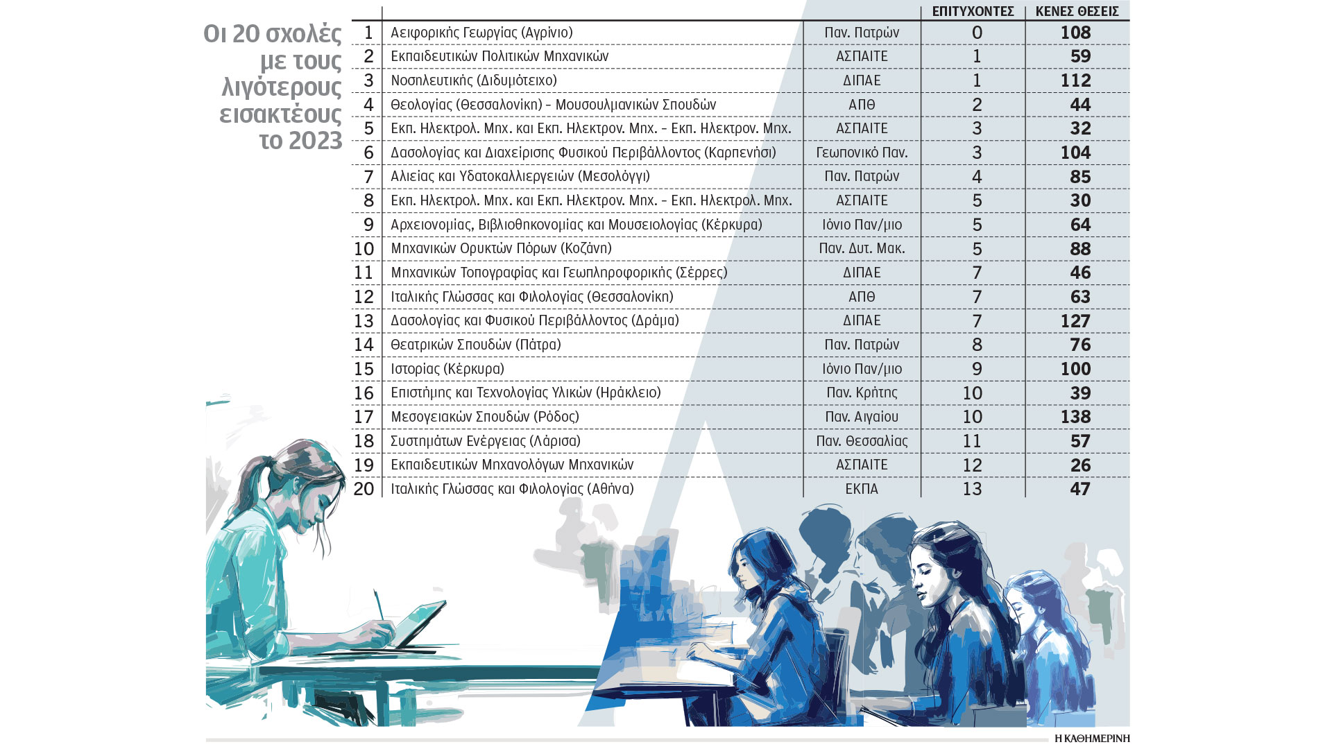 Ειδικότερα, σύμφωνα με την επεξεργασία των στοιχείων των Πανελλαδικών Εξετάσεων από τον μαθηματικό Στράτο Στρατηγάκη, το 2023 σε 18 τμήματα εισήχθησαν έως 10 υποψήφιοι γενικού λυκείου. Πρόκειται για τμήματα σε περιφερειακά πανεπιστήμια, με αντικείμενο χαμηλής ζήτησης από την αγορά εργασίας. Ενδεικτικό είναι ότι στο Τμήμα Αειφορικής Γεωργίας στο Αγρίνιο δεν εισήχθη ούτε ένας υποψήφιος.