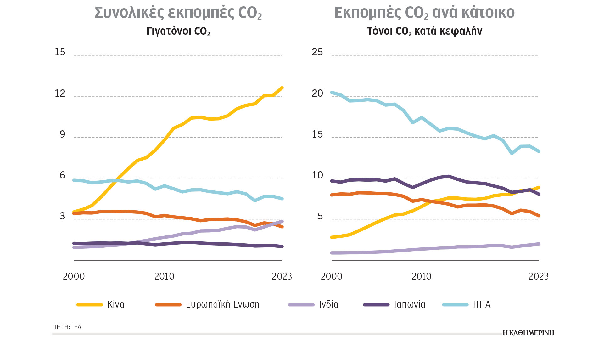 Στις συνολικές εκπομπές CO2, την πρώτη θέση κατέχει η Κίνα, ακολουθούμενη από τις (με πτωτική πορεία) Ηνωμένες Πολιτείες και την (με ανοδική πορεία) Ινδία. Οι χώρες της Ασίας αντιπροσωπεύουν άνω του 50% των παγκόσμιων εκπομπών. Στις κατά κεφαλήν εκπομπές, η Ινδία κατατάσσεται στην τελευταία θέση, με την Ευρωπαϊκή Ενωση να πραγματοποιεί μείωση και πλέον να έχει 40% λιγότερες από αυτές της Κίνας, που το 2023 ξεπέρασε την Ιαπωνία, ανεβαίνοντας στη 2η θέση. Η Κίνα ακολουθεί και εδώ ανοδική τάση, αν και ακόμη παραμένει σε χαμηλότερα επίπεδα από τις (μακράν) πρώτες Ηνωμένες Πολιτείες.