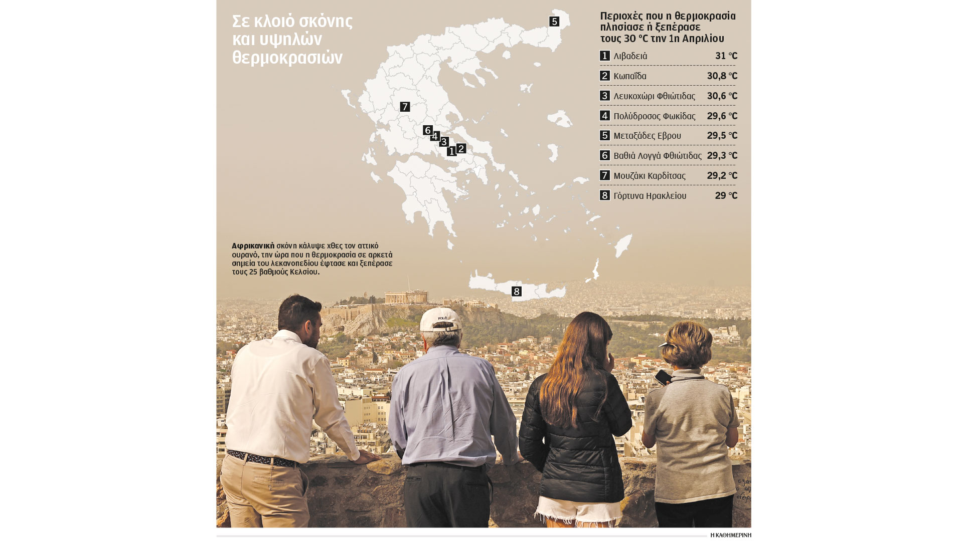 Θερμοκρασίες ρεκόρ σημειώθηκαν και χθες στη χώρα, με το κύμα εαρινής ζέστης να εξακολουθεί να επηρεάζει και σήμερα και τις επόμενες μέρες, σε ένα πολύ ιδιαίτερο φαινόμενο. Είναι πραγματικά εντυπωσιακό αρχές Απριλίου να σημειώνονται θερμοκρασίες πλησίον ή άνω των 30 βαθμών Κελσίου, όπως στη Λιβαδειά που το θερμόμετρο έδειξε χθες μέγιστη θερμοκρασία 31 °C, στην Κωπαΐδα 30,8 °C, στην Πολύδροσο Φωκίδας 29,6 °C, στο Μουζάκι Καρδίτσας 29,2 °C και στη Γόρτυνα Ηρακλείου 29 °C.