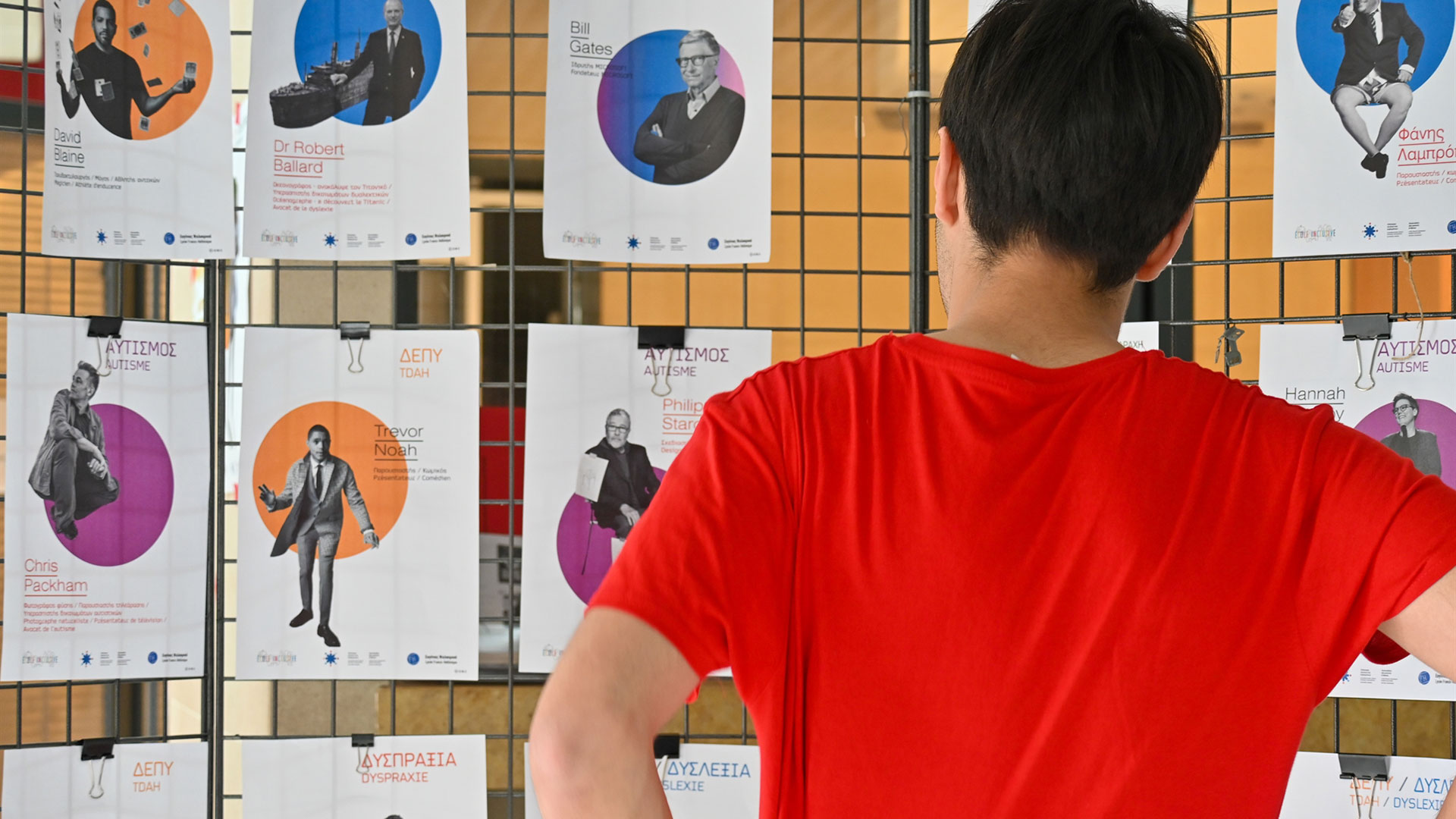 «Και ξαφνικά μαθαίνεις ότι ο φίλος σου, ο συμμαθητής που κάθεται στο διπλανό θρανίο έχει μία αναπτυξιακή διαταραχή. Εχει, ας πούμε, δυσλεξία ή αυτισμό. Τι κάνεις, πώς συμπεριφέρεσαι; Αλλάζει η ματιά σου απέναντί του;» μου λέει η 17χρονη Στέλλα Σκουρολιάκου. Η Στέλλα, μαθήτρια της Β΄ Λυκείου, ανέλαβε χθες μαζί με τον συμμαθητή της Αινεία Χουντάλα να με «ξεναγήσουν» στην Εβδομάδα Συμπεριληπτικού Σχολείου που διοργανώνει αυτές τις ημέρες το σχολείο τους, η «Ελληνογαλλική Σχολή Ευγένιος Ντελακρουά». Η αμηχανία των παιδιών στην αρχή έκδηλη, ο λόγος τους φιλτραρισμένος, καλλιεπής.