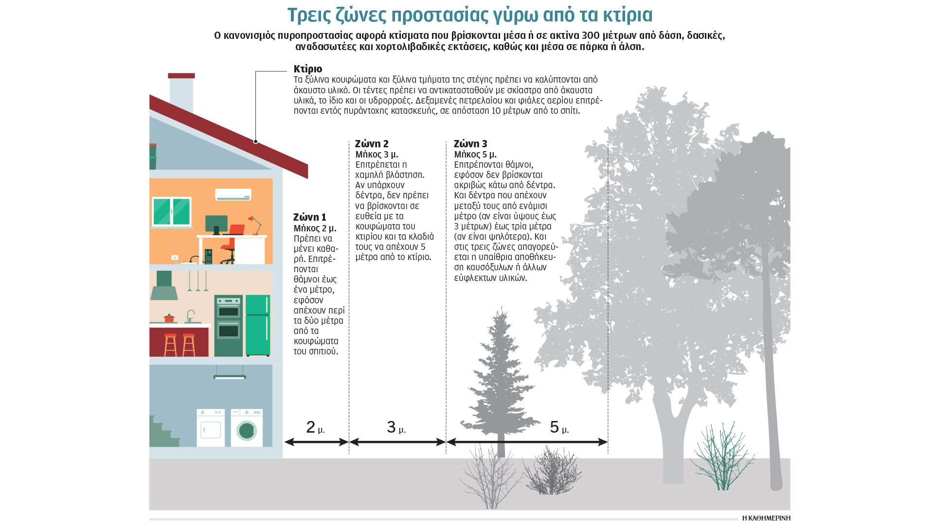 Ο κανονισμός πυροπροστασίας, που εγκρίθηκε πριν από περίπου ένα έτος (ΦΕΚ 3475Β/23) αφορά κτίρια που βρίσκονται μέσα ή σε ακτίνα 300 μέτρων από δάση, δασικές, αναδασωτέες και χορτολιβαδικές εκτάσεις, καθώς και μέσα σε πάρκα ή άλση. Στόχος του κανονισμού είναι να επιβραδύνει τον ρυθμό και την ένταση μιας δασικής πυρκαγιάς και προφανώς να προστατεύσει ζωές και περιουσίες.