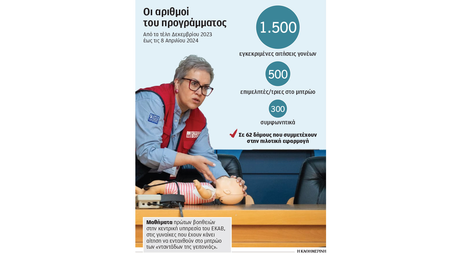 «Στην Ελλάδα μέχρι και σήμερα δεν θεωρείται προαπαιτούμενο να έχουν παρακολουθήσει σεμινάριο πρώτων βοηθειών όσοι εργάζονται με παιδιά», επισημαίνει στην «Κ» η κ. Βασιλική Δημητροπούλου, γιατρός αναισθησιολόγος, διευθύντρια Σχολών του ΕΚΑΒ και συντονίστρια όλων των εκπαιδευτικών προγραμμάτων. Ως εκ τούτου το ΕΚΑΒ δέχεται κάθε χρόνο πάνω από 5.000 αιτήματα για εκπαιδεύσεις, τα οποία ως επί το πλείστον αναλαμβάνουν εθελοντικά οι διασώστες του. Το νέο πρόγραμμα του υπουργείου αποτελεί την πρώτη οργανωμένη προσπάθεια, καθώς περιλαμβάνει μεταξύ των απαιτούμενων πιστοποιητικών για την ένταξη στο μητρώο (γνωματεύσεις γιατρών δημοσίων νοσοκομείων, απολυτήριο λυκείου ή πιστοποιητικό γλωσσομάθειας κ.ά.) και την επιτυχία στις εξετάσεις του ΕΚΑΒ. «Εκπαιδεύουμε εν δυνάμει νταντάδες από τον Σεπτέμβριο του 2022», διευκρινίζει η ίδια.