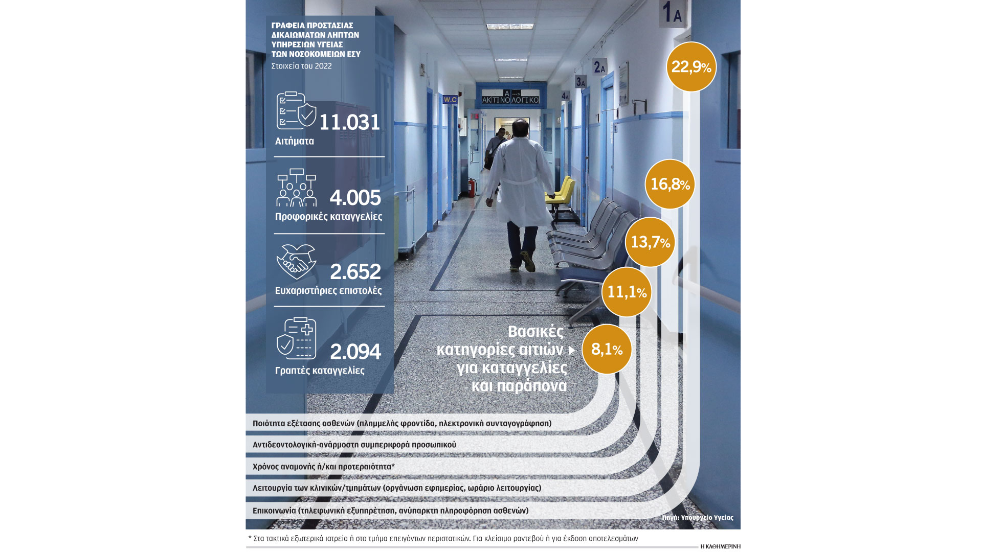 Το 2022 τα Γραφεία Προστασίας Δικαιωμάτων Ληπτών Υπηρεσιών Υγείας που λειτουργούν στα νοσοκομεία του ΕΣΥ δέχθηκαν 17.130 καταγγελίες, παράπονα και αιτήματα από ασθενείς ή/και συνοδούς τους. Την ίδια χρονιά τα τακτικά εξωτερικά ιατρεία των νοσοκομείων ΕΣΥ δέχθηκαν περίπου 5.607.000 επισκέψεις, τα τμήματα Επειγόντων Περιστατικών 4.267.000, ενώ καταγράφηκαν και 2.417.000 νοσηλείες. «Εάν συγκριθεί ο αριθμός των παραπόνων με την επισκεψιμότητα των νοσοκομείων του ΕΣΥ, γίνεται σαφές ότι οι πολίτες δεν γνωρίζουν για την ύπαρξη των Γραφείων Προστασίας Δικαιωμάτων Ληπτών Υπηρεσιών Υγείας». Την παραδοχή αυτή έκανε το απόγευμα της Πέμπτης η γενική γραμματέας Υπηρεσιών Υγείας Λίλιαν Βιλδιρίδη, η οποία συμμετείχε στην 3η ετήσια εκδήλωση της Ενωσης Ασθενών Ελλάδος για τη 18η Απριλίου – Ευρωπαϊκή Ημέρα Δικαιωμάτων των Ασθενών.