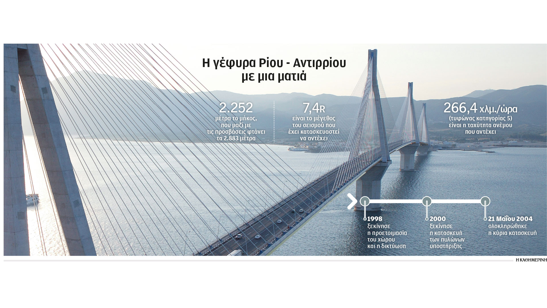 Η γέφυρα Ρίου – Αντιρρίου θεωρείται αριστούργημα της μηχανικής λόγω της δυσκολίας κατασκευής του έργου, που περιελάμβανε σειρά προκλήσεων, ενώ στα 20 χρόνια της λειτουργίας της εκτιμάται ότι συνέβαλε στο να αλλάξει ο οικονομικός χάρτης της Ελλάδας.