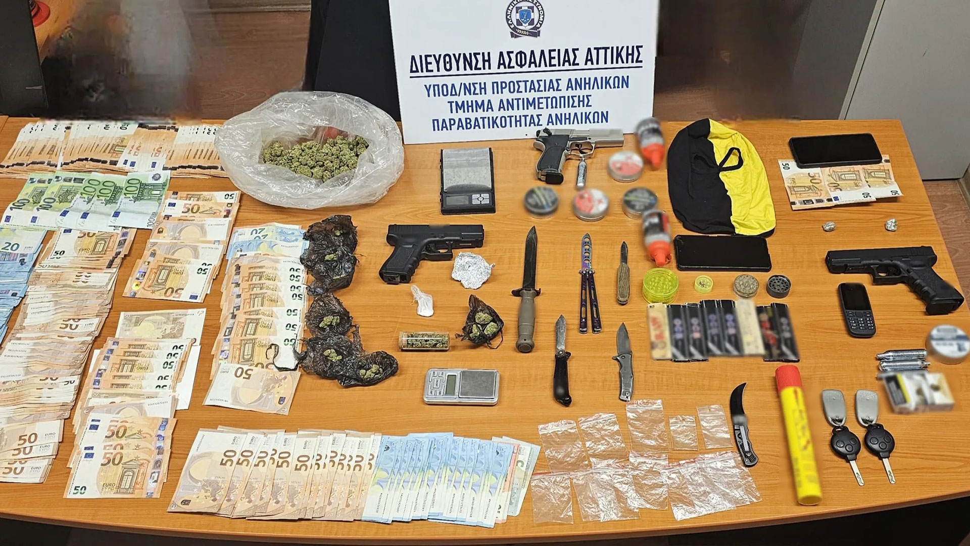 Από σωματικές έρευνες, όσο και από έρευνες στα σπίτια των συλληφθέντων, βρέθηκαν 183,37 γραμμ. ακατέργαστης κάνναβης, 6 τρίφτες, ζυγαριά, νάιλον συσκευασίες, 2 αεροβόλα πιστόλια με 7 μεταλλικές συσκευασίες που περιείχαν πλήθος σφαιριδίων, ναυτική φωτοβολίδα, ξιφολόγχη, 5 πτυσσόμενα μαχαίρια (τύπου σουγιάς και πεταλούδα), κουκούλα full face, «επιχειρησιακά» κινητά τηλέφωνα, ιδιόχειρες σημειώσεις, καθώς και 12.667 ευρώ και 200 δολάρια.