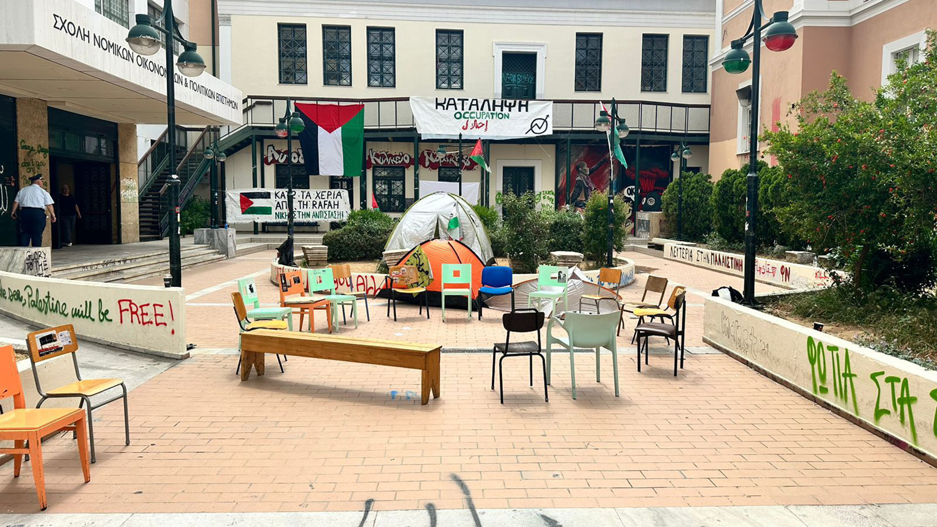 Υπενθυμίζεται ότι από τα ξημερώματα το κτίριο τελούσε υπό κατάληψη στο πλαίσιο κινητοποιήσεων υπέρ της Παλαιστίνης. Χθες το βράδυ έγινε ολονύχτια συγκέντρωση αλληλεγγύης στον λαό της Παλαιστίνης στα Προπύλαια.