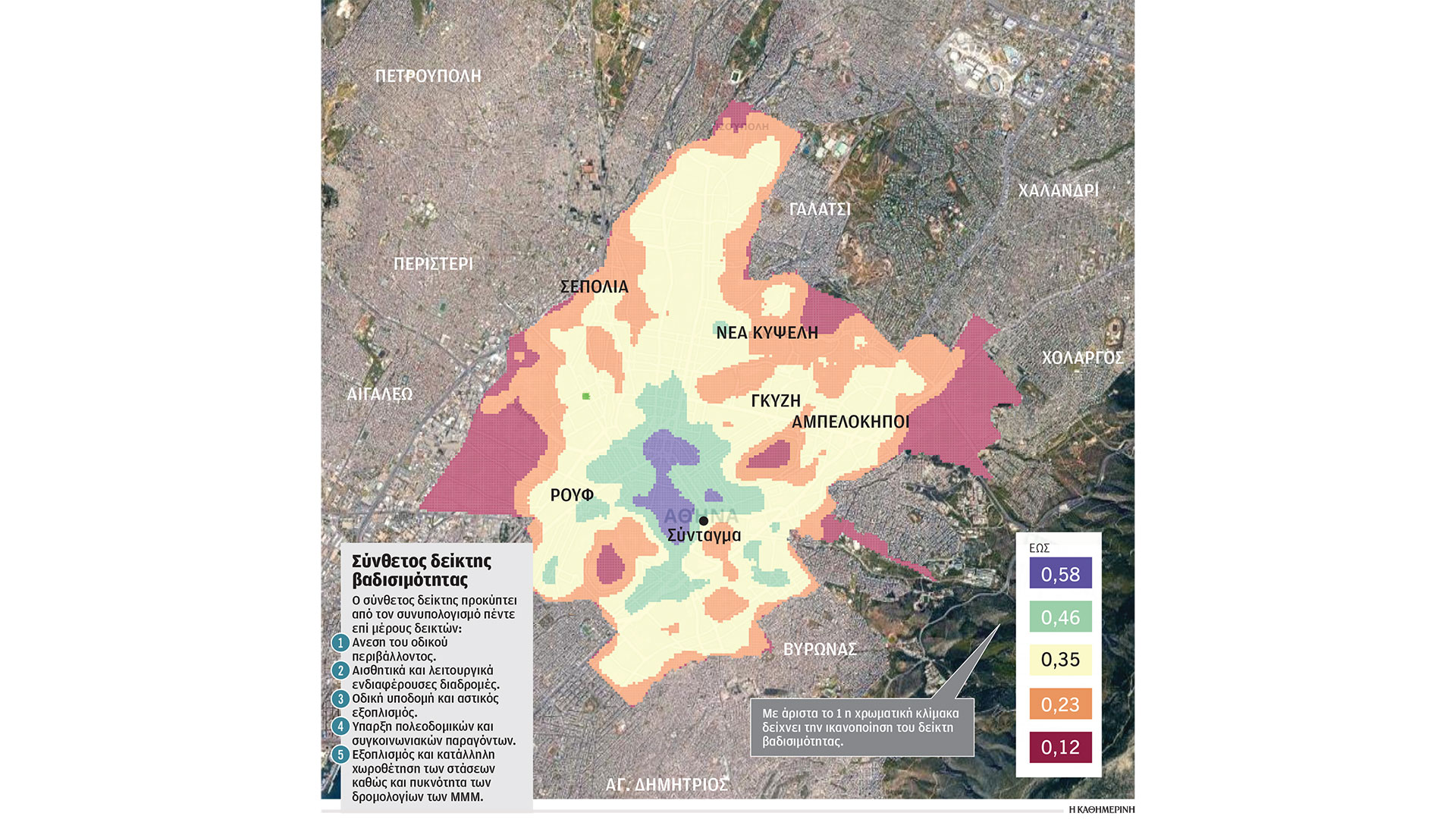 Στην πέμπτη ενότητα παρουσιάζεται η τελική πολύπλευρη αξιολόγηση των γειτονιών της Αθήνας όσον αφορά τον Σύνθετο Δείκτη Βαδισιμότητας, δηλαδή τον δείκτη που προκύπτει από τον συνυπολογισμό πέντε παραγόντων: την άνεση του οδικού περιβάλλοντος για τον πεζό (π.χ. δρόμοι ήπιας κυκλοφορίας, με πράσινο και σκιά), τις αισθητικά και λειτουργικά ενδιαφέρουσες διαδρομές, την οδική υποδομή και τον αστικό εξοπλισμό για τη διευκόλυνση των πεζών (από πλάτος πεζοδρομίων, μέχρι ράμπες και φωτισμό), την ύπαρξη πολεοδομικών και συγκοινωνιακών παραγόντων (π.χ. μεικτές χρήσεις γης, πυκνότητα στάσεων μέσων μαζικής μεταφοράς, μαγαζιά) και τέλος τον εξοπλισμό και την κατάλληλη χωροθέτηση των στάσεων, όσο και την πυκνότητα των δρομολογίων. Τέλος, η έκτη ενότητα περιέχει τις προτάσεις στρατηγικής του ΕΜΠ για την ενίσχυση του βαδίσματος.