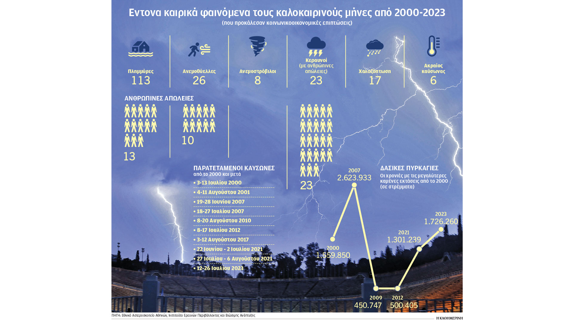 Οπως φαίνεται από τη βάση δεδομένων του Αστεροσκοπείου, τους καλοκαιρινούς μήνες το 2000-2023 έχουν σημειωθεί 193 έντονα καιρικά φαινόμενα (με σημαντικές κοινωνικές συνέπειες) και πιο συγκεκριμένα: 113 πλημμύρες, 26 ανεμοθύελλες, 8 ανεμοστρόβιλοι, 23 επεισόδια με κεραυνούς (με ανθρώπινες απώλειες), 17 χαλαζοπτώσεις, ενώ ως επεισόδια ακραίου καύσωνα έχουν συμπεριληφθεί 6 περιπτώσεις. Εχει σημασία η ποικιλία των απειλών, καθώς για παράδειγμα η μάλλον υποτιμημένη –όσον αφορά την επικινδυνότητά της– κεραυνική δραστηριότητα έχει προκαλέσει 23 νεκρούς από το 2000 σε θερινούς μήνες, ενώ άλλοι 13 άνθρωποι έχουν πνιγεί από πλημμύρες και 10 από ανεμοθύελλα (οι 7 από μια τρομερή καταιγίδα στη Χαλκιδική στις 10 Ιουλίου 2019).