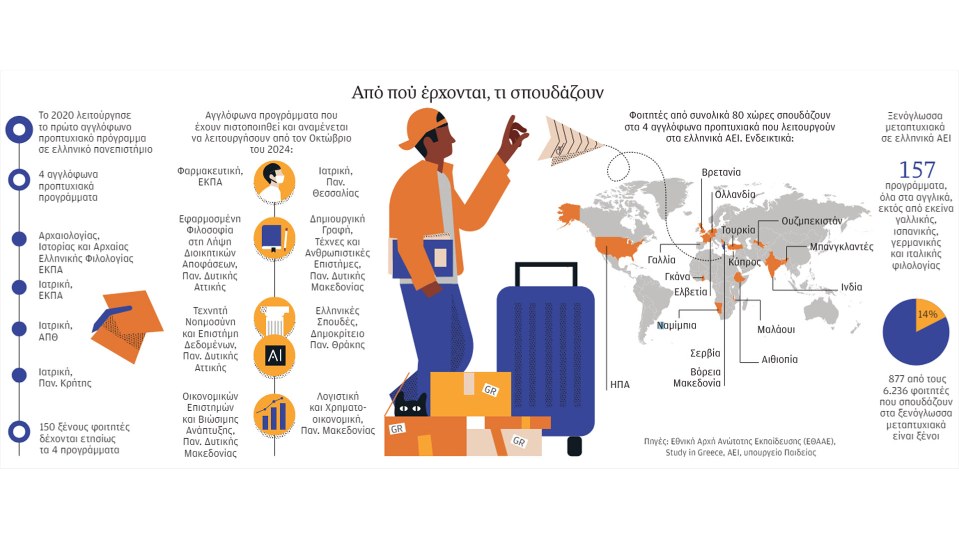 Εγκριση για λειτουργία από το επόμενο ακαδημαϊκό έτος 2024-2025 έχουν λάβει από την Εθνική Αρχή Ανώτατης Εκπαίδευσης (ΕΘΑΑΕ) επτά αγγλόφωνα προγράμματα σε έξι ελληνικά πανεπιστήμια. Μάλιστα, σύμφωνα με τα στοιχεία των ιδρυμάτων, η ζήτηση για τις θέσεις των αγγλόφωνων έχει αυξηθεί. «Πρόκειται για απόδειξη της εξωστρέφειας και της δυναμικής των ελληνικών πανεπιστημίων. Διαθέτουν υψηλού επιπέδου προσωπικό, η επιτυχία βέβαια απαιτεί καλή οργάνωση, συντονισμό ενεργειών και καλή προβολή των προγραμμάτων», παρατηρεί στην «Κ» ο Χρήστος Μιχαλακέλης, πανεπιστημιακός και πρόεδρος του Study in Greece (SiG), του εθνικού φορέα διεθνοποίησης της τριτοβάθμιας εκπαίδευσης.