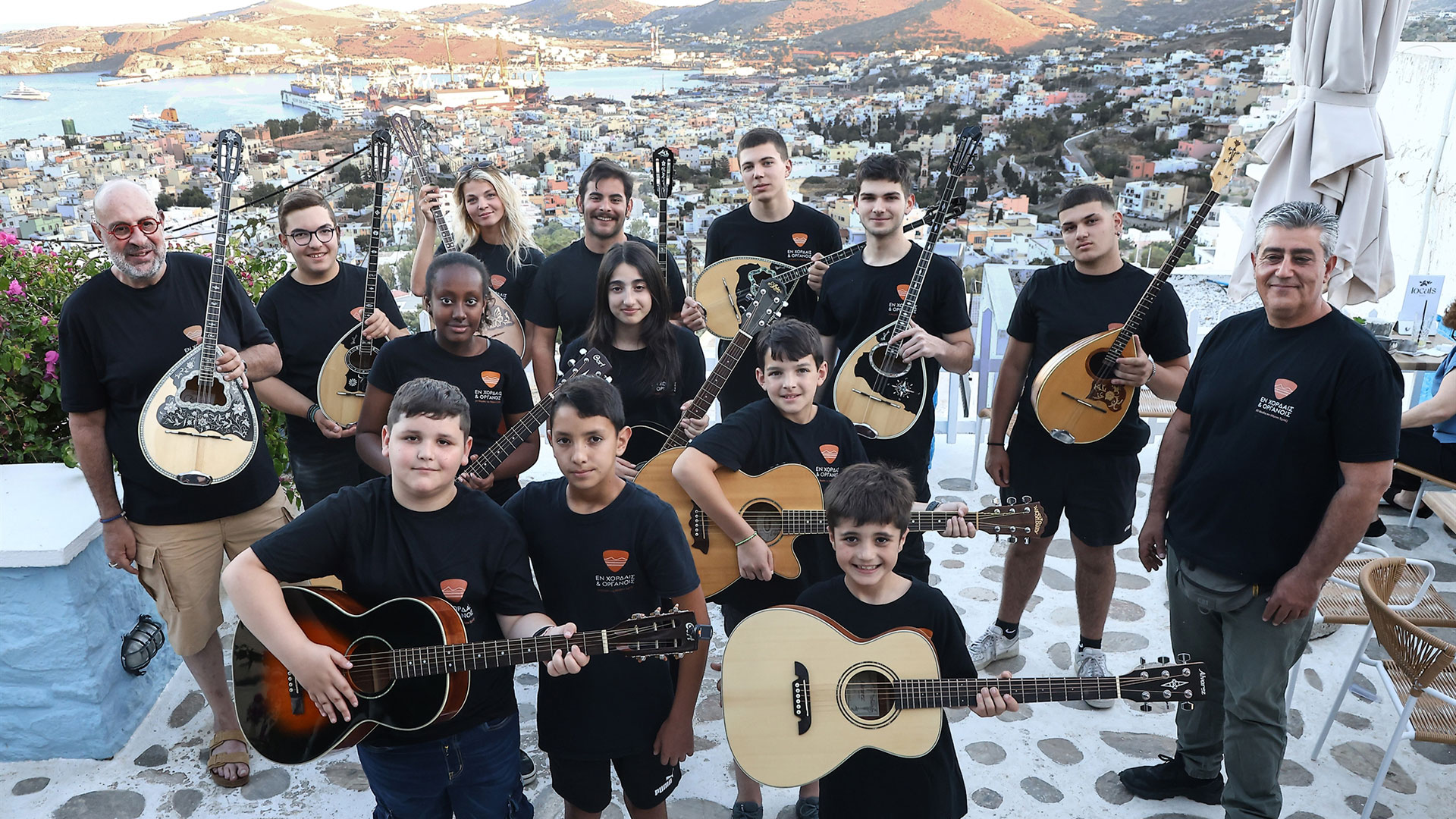 Οπως το επόμενό μας ραντεβού που ήταν με 15 πιτσιρίκια με μπουζούκια και κιθάρες. Μας περίμεναν λίγο πιο κάτω στα λευκά στενά, εκεί όπου βρίσκεται το άγαλμα του ρεμπέτη. Είναι οι μαθητές της Μεγάλης του Μάρκου Σχολής, αλλιώς «Εν Χορδαίς και Οργάνοις», που ιδρύθηκε το 2017 με την πρωτοβουλία του Σταύρου Ξαρχάκου και άλλων πεφωτισμένων ανθρώπων. «Προσπαθούμε με νύχια και με δόντια να κρατήσουμε ζωντανό το ρεμπέτικο, το λαϊκό και τη βυζαντινή παράδοση», μας εξηγούσε ο Αρίστος Βαμβακούσης, ένας επαγγελματίας δεξιοτέχνης του μπουζουκιού που διδάσκει εκεί. Η Σχολή στην Ερμούπολη έχει 100 εγγεγραμμένους εκ των οποίων οι 40 μαθαίνουν μουσική και οι υπόλοιποι εικαστικά και ελεύθερο σχέδιο. «Το παλεύουμε και όσο υπάρχουν τέτοιες προσπάθειες η Σύρα δεν θα γίνει μόνο τουρισμός. Εκτός από εμάς υπάρχουν και πολλές θεατρικές ομάδες, ομάδες χορού, αθλητικοί σύλλογοι, πυρήνες ανθρώπων που δίνουν αγώνα να υπάρχει ποικιλία και ερεθίσματα τους μήνες εκτός θερινής σεζόν. Αυτό μας σώζει, η ζωή τον χειμώνα».