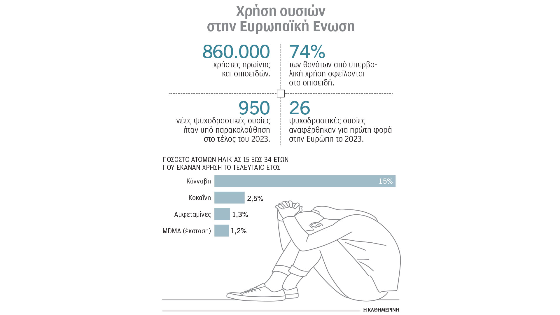 Μια εξαιρετικά πολύπλοκη και ταχέως εξελισσόμενη αγορά ναρκωτικών –όπου οι καθιερωμένες παράνομες ψυχοδραστικές ουσίες είναι ευρέως προσβάσιμες–, τη συνεχή εμφάνιση νέων ισχυρών συνθετικών ουσιών και τη χρήση πολλαπλών ουσιών ως ένα σύνηθες φαινόμενο περιγράφει η ευρωπαϊκή έκθεση για τα ναρκωτικά 2024, που εξέδωσε χθες το Ευρωπαϊκό Κέντρο Παρακολούθησης Ναρκωτικών και Τοξικομανίας.