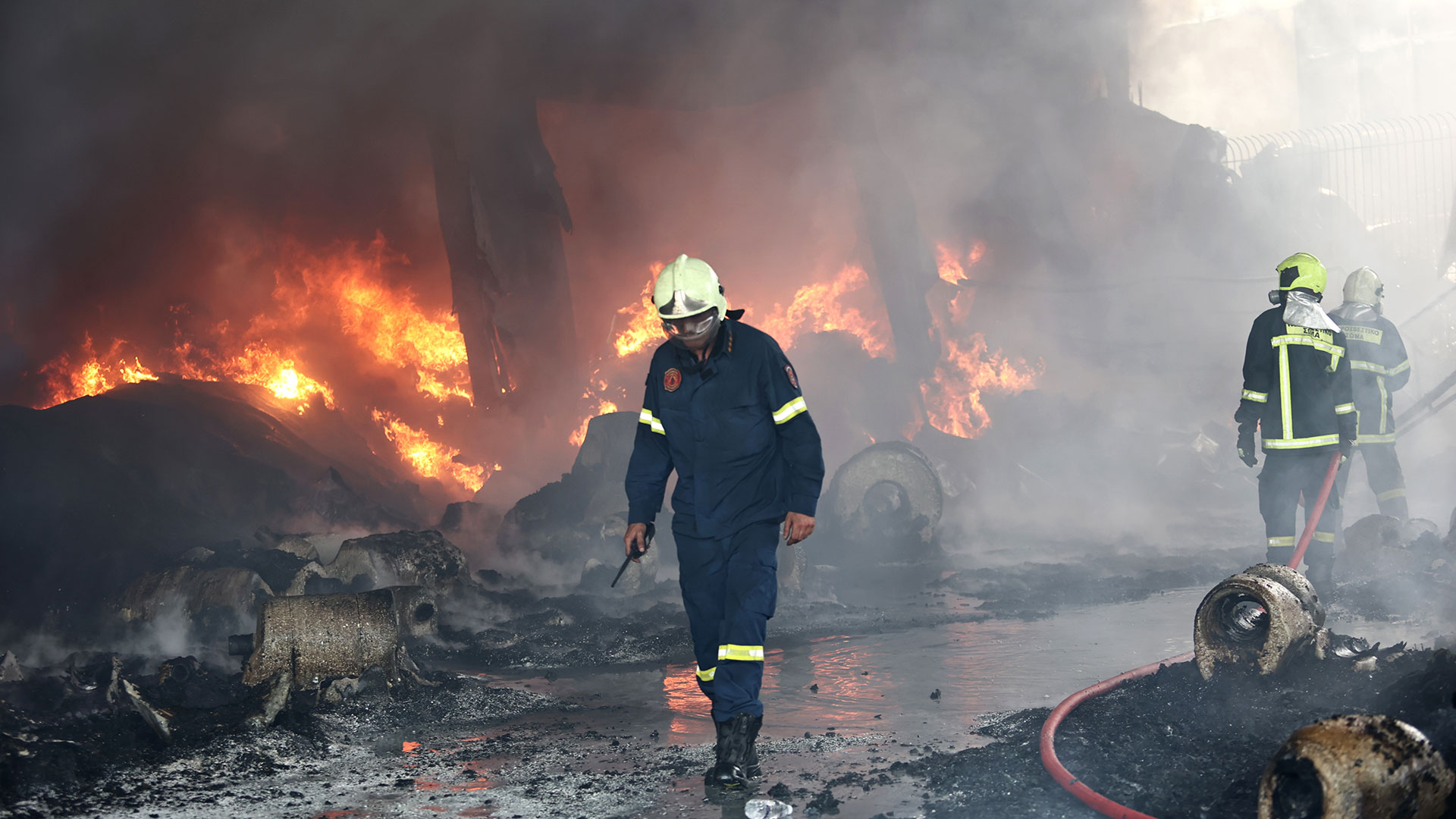 Από τη φωτιά στο εργοστάσιο, το οποίο, σύμφωνα με πληροφορίες, έχει καεί ολοσχερώς, πυκνός μαύρος καπνός υψώνεται στην ατμόσφαιρα, ενώ επίγειες και εναέριες πυροσβεστικές δυνάμεις επιχειρούν να εμποδίσουν την επέκτασή της.