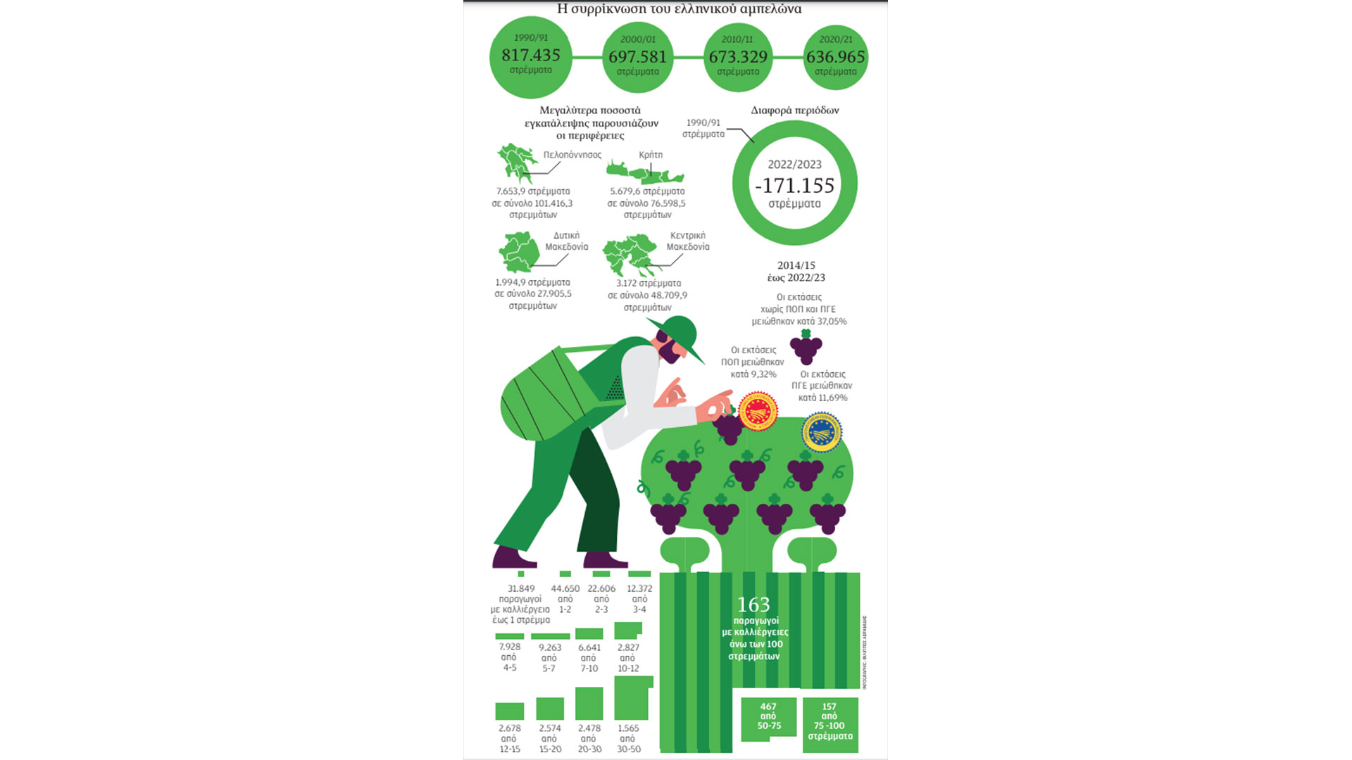 Την ίδια στιγμή που το ελληνικό κρασί κατακτά τη μία αγορά μετά την άλλη και γίνεται γνωστό σε όλο τον κόσμο, ο ελληνικός αμπελώνας ο οποίος δίνει την πρώτη ύλη για να δημιουργηθούν ξεχωριστοί οίνοι, συρρικνώνεται διαρκώς τις τρεις τελευταίες δεκαετίες. Είναι αναμενόμενο οι μικροί αμπελουργοί, που καλλιεργούσαν το αμπελάκι τους στο πλαίσιο της οικιακής οικονομίας της υπαίθρου, να εγκαταλείπουν σταδιακά την καλλιέργεια. Oμως τα στρέμματα που βγαίνουν εκτός καλλιέργειας δεν αντικαθίστανται από άλλα φυτεμένα με πιο δυναμικές ποικιλίες. Πολλοί επαγγελματίες αμπελουργοί από το 2016 έως και σήμερα δεν μπορούν να αποκτήσουν νέες άδειες φύτευσης λόγω των κριτηρίων επιλεξιμότητας που έχουν τεθεί από το υπουργείο Αγροτικής Ανάπτυξης.