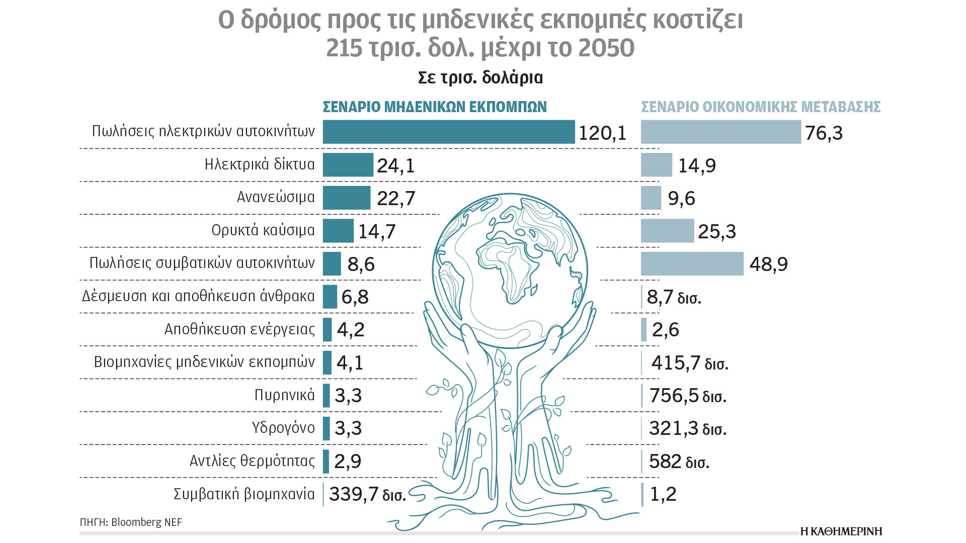 Για την επίτευξη μηδενικών εκπομπών το 2050, απαιτούνται 215 τρισ. δολάρια πράσινων επενδύσεων, ποσό σημαντικά χαμηλότερο, των τουλάχιστον 20 τρισ. δολαρίων κάθε χρόνο έως το 2050 που απαιτούνται λόγω των κλιματικών επιπτώσεων, σύμφωνα με πρόσφατη μελέτη (2024) του Potsdam Institute for Climate Impact Research. Στη μελέτη αναφέρονται, για παράδειγμα, οι νέες πωλήσεις αυτοκινήτων, τα οποία από το 2034 και έπειτα θα πρέπει να είναι μόνο ηλεκτρικά βάσει των κανονισμών, και το κόστος θα ανέρχεται σε 120,1 τρισ. δολάρια, οι τεχνολογίες δέσμευσης και αποθήκευσης άνθρακα με κόστος 6,8 τρισ. δολάρια και οι επενδύσεις σε ανανεώσιμα και ηλεκτρικά δίκτυα που θα φτάνουν αθροιστικά στα 46,8 τρισ. δολάρια.