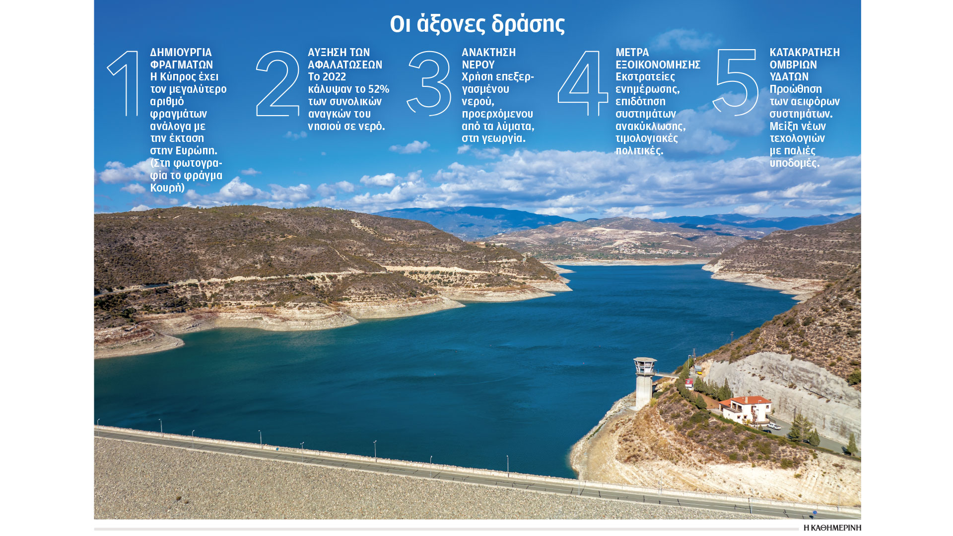 Πρώτο σημείο, είναι ο βασικός στόχος «ούτε μία σταγόνα βροχής να μην καταλήγει στη θάλασσα». «Καθώς είμαστε νησί και δεν υπάρχουν μεγάλες επιφάνειες, τα νερά της βροχής έφταναν εύκολα στη θάλασσα και χάνονταν», εξηγεί ο κ. Αριστείδου. «Γι’ αυτό κατασκευάστηκαν πολλά φράγματα. Σήμερα καλύπτουν το 80% των λεκανών απορροής». Η Κύπρος, με 108 φράγματα, με συνολική χωρητικότητα 332 εκατ. κυβικών μέτρων νερού, είναι η χώρα με τον μεγαλύτερο αριθμό φραγμάτων ανάλογα με την έκταση στην Ευρώπη.