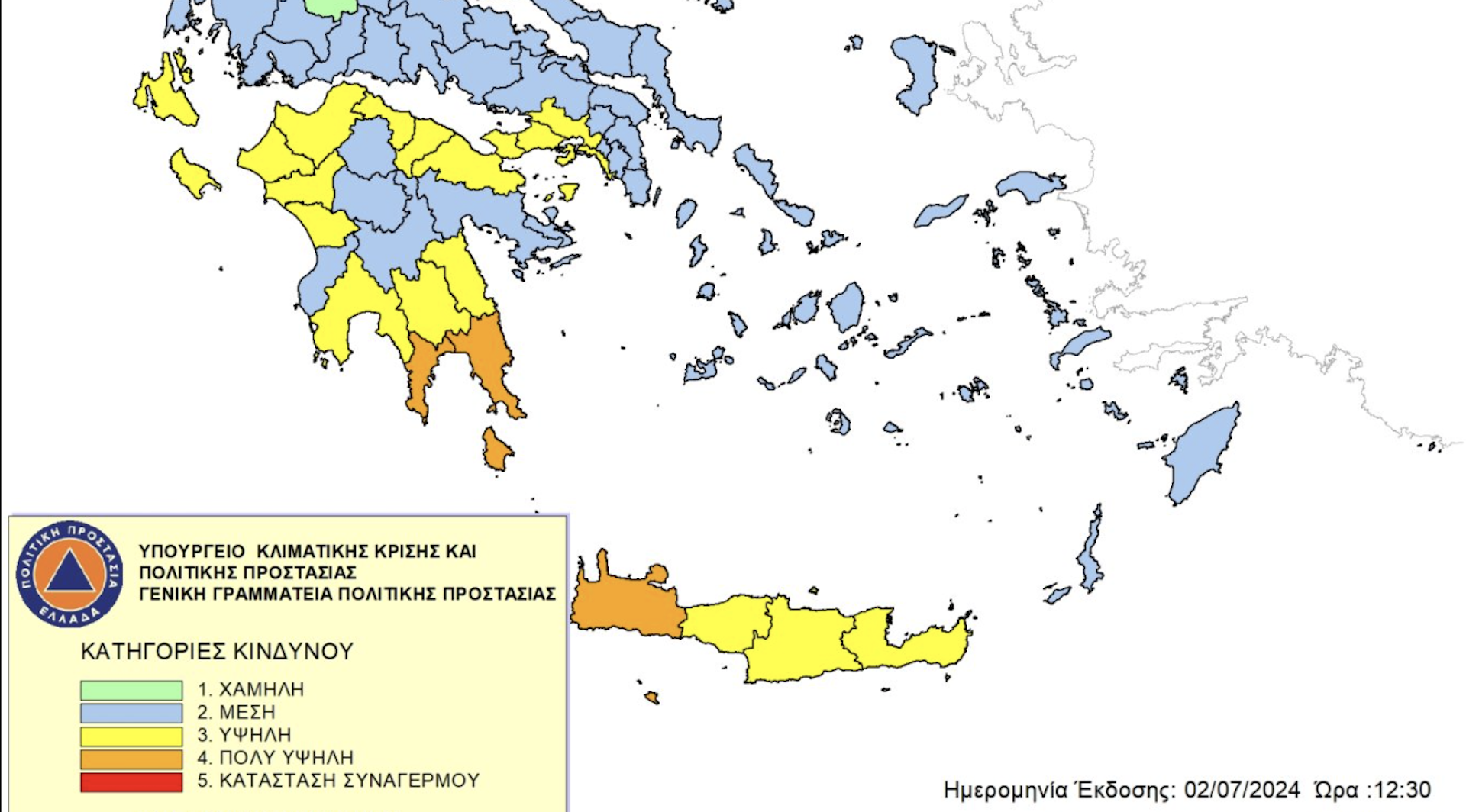 Σύμφωνα με τον Χάρτη Πρόβλεψης Κινδύνου Πυρκαγιάς που εκδίδει η Γενική Γραμματεία Πολιτικής Προστασίας του υπουργείου Κλιματικής Κρίσης και Πολιτικής Προστασίας, για αύριο, Τετάρτη, 3 Ιουλίου, προβλέπεται πολύ υψηλός κίνδυνος πυρκαγιάς (κατηγορία κινδύνου 4) για τις εξής περιοχές: