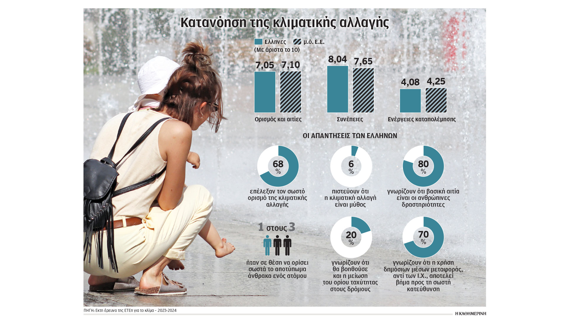 Με δεδομένο ότι η κατανόηση της κλιματικής πρόκλησης αποτελεί το πρώτο βήμα για την αντιμετώπισή της, η ΕΤΕπ διερεύνησε τις γνώσεις μας σε τρεις βασικούς τομείς: στους ορισμούς και τις αιτίες, στις συνέπειες και στις λύσεις. Στην έρευνα συμμετείχαν περισσότεροι από 30.000 ερωτηθέντες σε 35 χώρες, συμπεριλαμβανομένων των κρατών-μελών της Ε.Ε., του Ηνωμένου Βασιλείου, των ΗΠΑ, της Κίνας, της Ιαπωνίας, της Ινδίας και του Καναδά, οι οποίοι απάντησαν σε 12 ερωτήσεις και βαθμολογήθηκαν σε μια κλίμακα από το 0 έως το 10 (όπου το 10 υποδεικνύει το υψηλότερο επίπεδο γνώσης). Οι Ελληνες είναι ως επί το πλείστον ενημερωμένοι για τις αιτίες και τις συνέπειες της κλιματικής αλλαγής, αλλά εμφανίζουν αρκετά κενά γνώσης σε ό,τι αφορά στις λύσεις. Οπως και στις περισσότερες χώρες της Ε.Ε., πολλοί Ελληνες ερωτηθέντες δεν γνωρίζουν, για παράδειγμα, ότι η μείωση των ορίων ταχύτητας στους δρόμους (80%) ή η καλύτερη μόνωση των κτιρίων (57%) μπορεί επίσης να συμβάλει στην καταπολέμηση της κλιματικής αλλαγής.