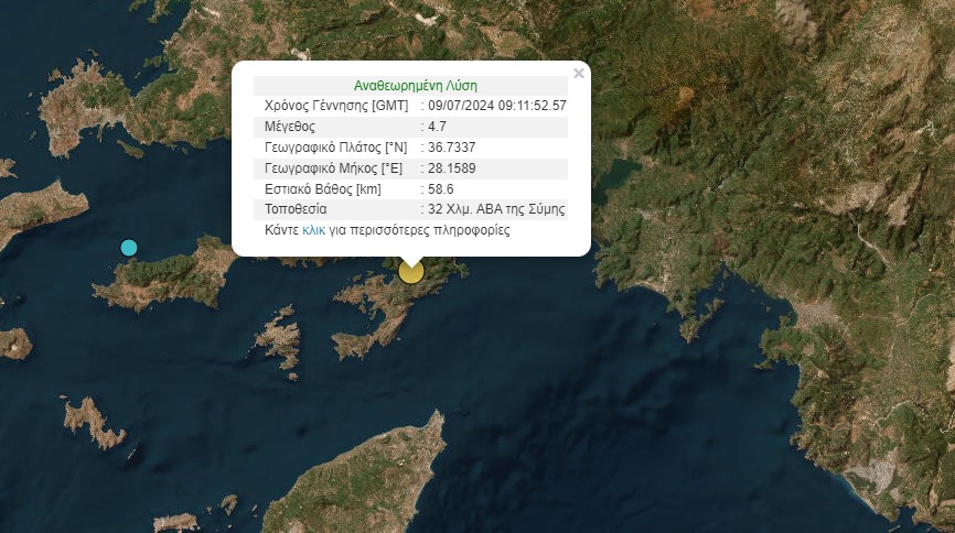 Σεισμική δόνηση σημειώθηκε πριν από λίγο 32 χλμ. ανατολικά-βορειοανατολικά της Σύμης.