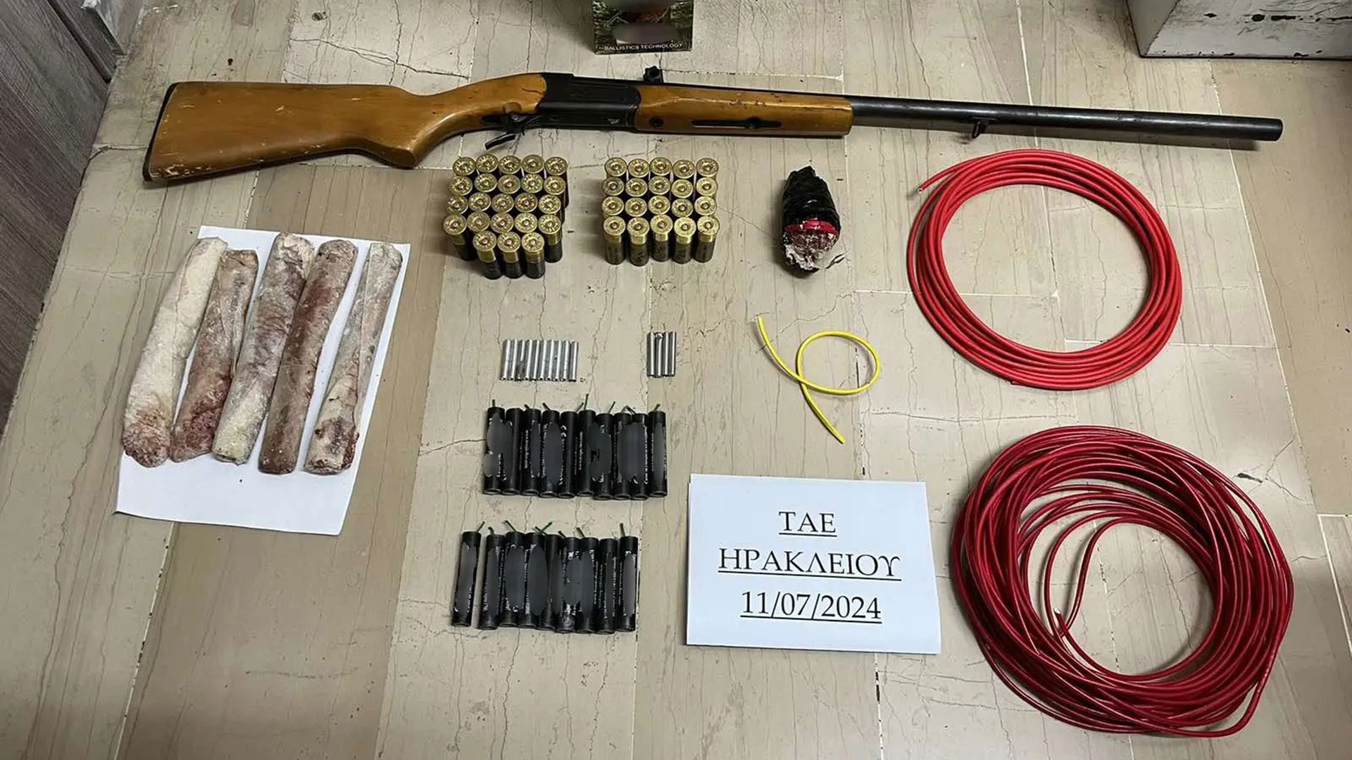 Σύμφωνα με την ΕΛ.ΑΣ., κατά τη διάρκεια έρευνας που πραγματοποιήθηκε στην οικία και αποθήκη του κατηγορούμενου, εντοπίστηκαν, μεταξύ άλλων, 156,34 γραμμάρια ζελατινοδυναμίτιδας και 841,1 γραμμάρια δυναμίτιδας, η οποία ήταν συσκευασμένη σε κυλίνδρους.