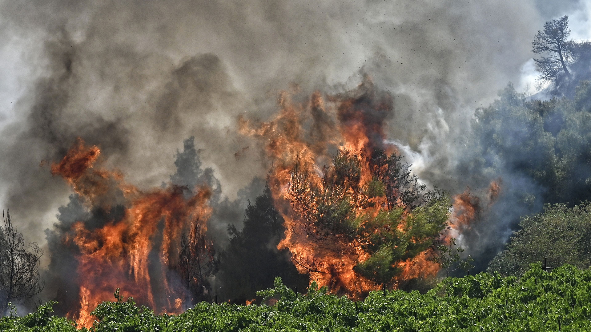 Σύμφωνα με την Πυροσβεστική, η φωτιά εξελίσσεται μέσα σε ρεματιά με απότομες κλίσεις και πολύ πυκνή βλάστηση, χωρίς να απειλούνται οικισμοί.