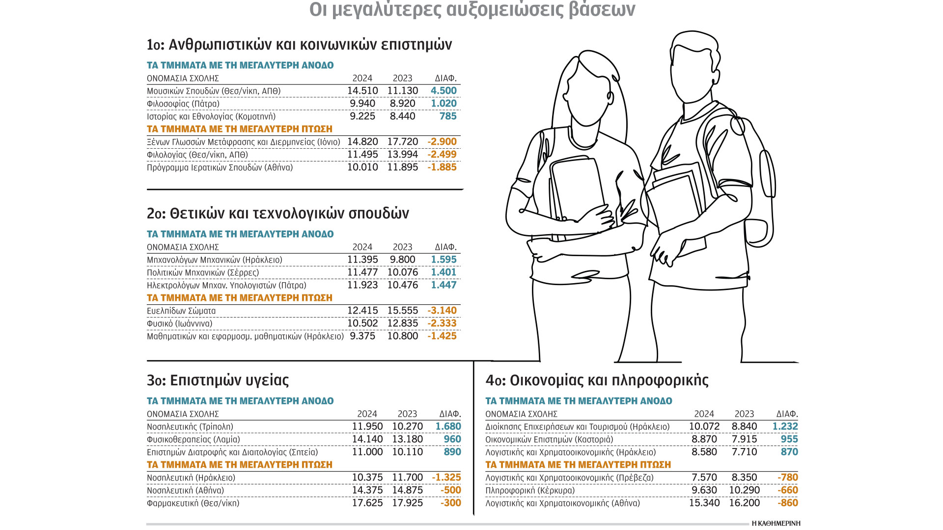 Στον αντίποδα, εντυπωσιακή είναι η άνοδος των σχολών μουσικών σπουδών σε Αθήνα, Θεσσαλονίκη και Αρτα, η βάση εισαγωγής των οποίων αυξήθηκε μέχρι και 4.500 μόρια. Στις υπόλοιπες σχολές του πρώτου πεδίου, των ανθρωπιστικών σπουδών, η πτώση είναι εκκωφαντική. Αίσθηση προκαλεί η αντίστοιχη μείωση στη Φιλολογία Θεσσαλονίκης κατά 2.499 μόρια, στο Ιστορικό Αρχαιολογικό Ιωαννίνων κατά 896 μόρια και στην Αγγλική Φιλολογία του ΕΚΠΑ κατά 605 μόρια. Η βάση εισαγωγής στο Τμήμα Επικοινωνίας και ΜΜΕ στη Θεσσαλονίκη έκανε βουτιά 600 μορίων, στην Αθήνα 530 μορίων και στο Πάντειο 240 μορίων.