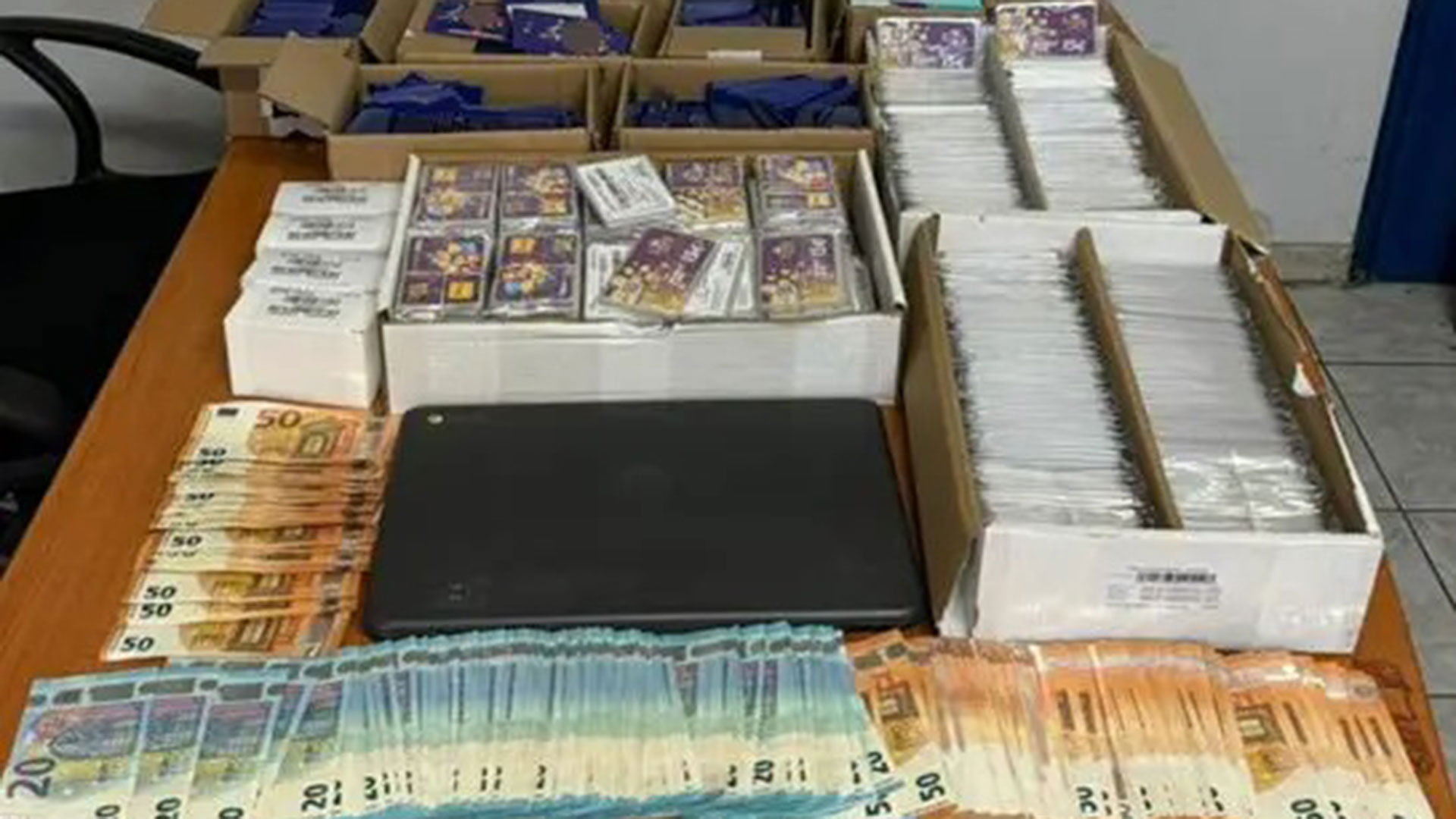 Κατά τη διάρκεια ερευνών που πραγματοποιήθηκαν στο σπίτι και στην κατοχή του, βρέθηκαν μεταξύ άλλων και κατασχέθηκαν 2.100 πακέτα σύνδεσης κινητής τηλεφωνίας, 6.090 κάρτες ανανέωσης κινητής τηλεφωνίας, το ποσό των 9.020 ευρώ, μία πλαστή άδεια διαμονής και δύο κινητά.