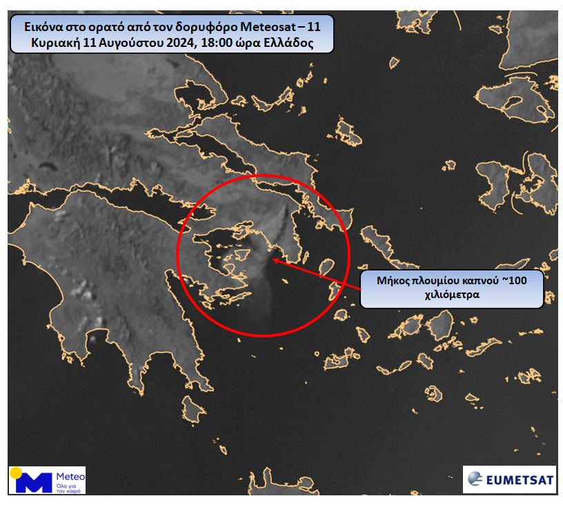 Ο καπνός από τη φωτιά στον Βαρνάβα Αττικής καταγράφηκε από τον Ευρωπαϊκό μετεωρολογικό δορυφόρο Meteosat-11. Οπως φαίνεται στη δορυφορική εικόνα, με τη βοήθεια των ενισχυμένων βορειοανατολικών ανέμων ο καπνός, έως τις 18:00, είχε ταξιδέψει περίπου 100 χιλιόμετρα.