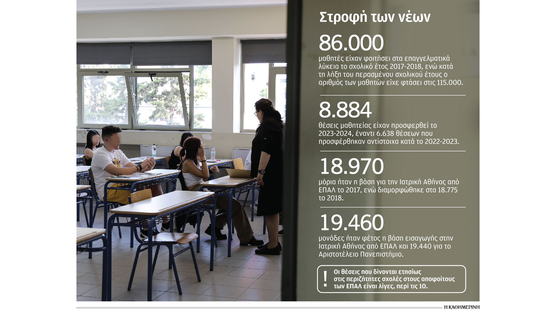 Στροφή των 15χρονων καταγράφεται τα τελευταία χρόνια προς τα επαγγελματικά λύκεια (ΕΠΑΛ). Ο αριθμός των μαθητών έχει αυξηθεί κατά 30.000, την ίδια στιγμή που οι επιδόσεις των αποφοίτων τους στις Πανελλαδικές Εξετάσεις έχουν εκτιναχθεί, κόντρα στην άποψη ότι τα επαγγελματικά λύκεια είναι ο «φτωχός συγγενής» της γενικής εκπαίδευσης. Η αύξηση των αριθμών και η βελτίωση των επιδόσεων των αποφοίτων τους οφείλεται στο άνοιγμα των ΑΕΙ και για τους αποφοίτους των ΕΠΑΛ και όχι μόνο σε εκείνους των γενικών λυκείων.