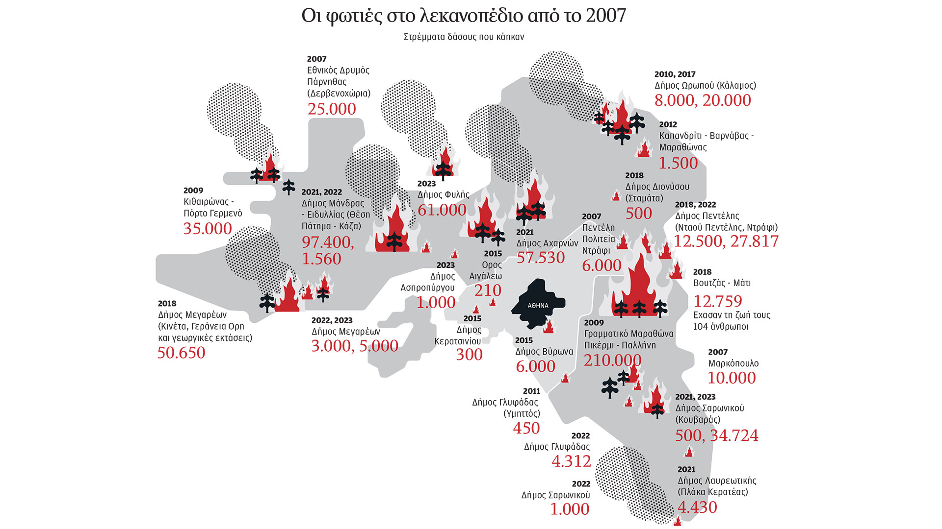 Εκπαιδευμένο στις φωτιές θεωρεί τον εαυτό του και ο Ευθύμης Ευθυμιάδης, μόνιμος κάτοικος Αγίου Στεφάνου. Ο παππούς του ήταν από τους πρώτους οικιστές της ευρύτερης περιοχής, που περιλαμβάνει τη γειτονική Σταμάτα μέχρι τις κάποτε ειδυλλιακές όχθες της λίμνης του Μαραθώνα. Η φωτιά σάρωσε για πολλοστή φορά αγαπημένες διαδρομές του ίδιου και των παιδιών του. «Στις βόλτες μας μαζεύαμε χόρτα, σπαράγγια, μανιτάρια. Τώρα δεν έμεινε τίποτα». Οσο κι αν ο ίδιος ακούγεται στη συνομιλία μας ψύχραιμος, ομολογεί ότι το θέαμα του καμένου δάσους είναι ένα από τα πιο «άγρια» που μπορεί να σκεφτεί κανείς και είναι αδύνατον να σε αφήσει ανεπηρέαστο. «Ακόμα κι αν επιλέξεις να σταματήσεις να περνάς από μέρη που σου θυμίζουν την καταστροφή για να μη στενοχωριέσαι, υπάρχει ένας άλλος ύπουλος τρόπος που σου την υπενθυμίζει. Και αυτός είναι η ξαφνική αλλαγή του μικροκλίματος της περιοχής. Μέσα σε μια μέρα, το δάσος που κρατούσε την υγρασία και τη δροσιά απλά δεν υπάρχει».