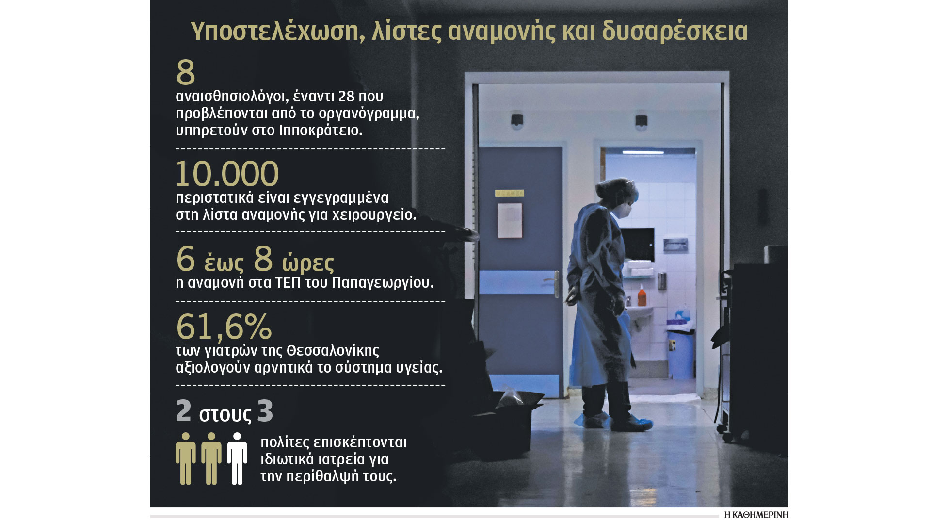 Ερευνα για τα προβλήματα που αντιμετωπίζουν οι μονάδες υγείας της Βόρειας Ελλάδας διενήργησε, ενόψει της ΔΕΘ, η Πανελλήνια Ομοσπονδία Εργαζομένων Δημοσίων Νοσοκομείων (ΠΟΕΔΗΝ). Οπως προκύπτει, στα νοσοκομεία της Θεσσαλονίκης το μεγάλο πρόβλημα είναι η έλλειψη αναισθησιολόγων και νοσηλευτικού, παραϊατρικού προσωπικού, αλλά και οι μεγάλες αναμονές για ραντεβού και χειρουργικές επεμβάσεις. Ενδεικτικά, στο ΑΧΕΠΑ από τις δέκα χειρουργικές αίθουσες λειτουργούν οι τέσσερις λόγω έλλειψης νοσηλευτικού προσωπικού και υλικών. Η αναμονή για ραντεβού στα τακτικά εξωτερικά ιατρεία, στα εργαστήρια και στον προγραμματισμό επεμβάσεων μπορεί να ξεπεράσει τον χρόνο. Στο Θεαγένειο και στο Ιπποκράτειο, 30% των οργανικών θέσεων σε όλες τις ειδικότητες είναι κενές. Στο Ιπποκράτειο λειτουργούν οι 6 από τις 14 αίθουσες. Υπηρετούν 8 αναισθησιολόγοι, έναντι 28 που προβλέπονται από το οργανόγραμμα. Στα ΤΕΠ του «Παπαγεωργίου» η αναμονή είναι 6 έως 8 ώρες. Λειτουργούν 10 από τις 14 αίθουσες χειρουργείων. Στη λίστα αναμονής για χειρουργείο είναι εγγεγραμμένα περίπου 10.000 περιστατικά.