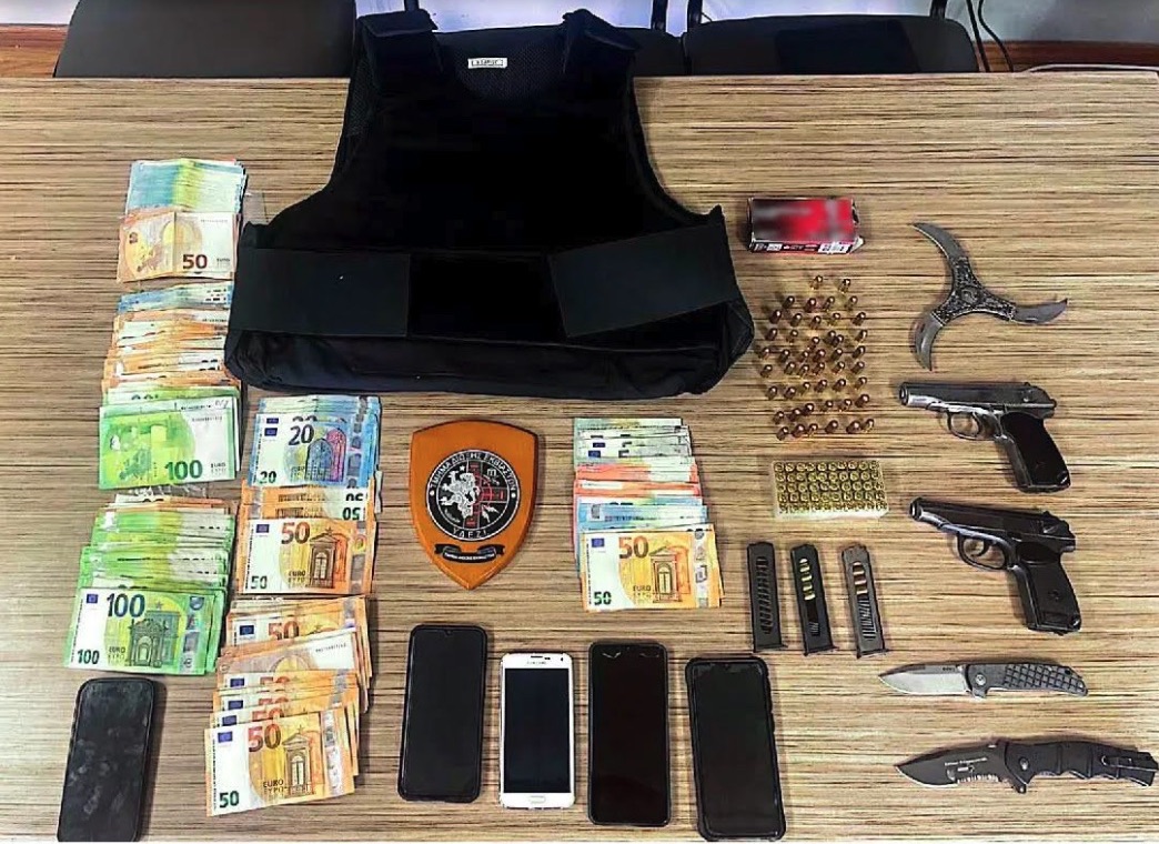 Από τις έρευνες στις οικίες των συλληφθέντων κατασχέθηκαν δύο πιστόλια, ένα αλεξίσφαιρο γιλέκο, τρία αναδιπλούμενα μαχαίρια και πλήθος φυσιγγίων διαφόρων διαμετρημάτων. Σε έρευνα που έκαναν οι αστυνομικοί σε μοτοσικλέτα ενός εκ των συλληφθέντων εντόπισαν 18.615 ευρώ. Δύο από τα μέλη της συμμορίας είχαν αρχηγικό ρόλο και οι υπόλοιποι λειτουργούσαν ως εισπράκτορες. Η έρευνα συνεχίζεται για να διαπιστωθεί το πλήρες εύρος της δραστηριότητάς τους και το ενδεχόμενο εμπλοκής τους και σε άλλες υποθέσεις στο νησί.