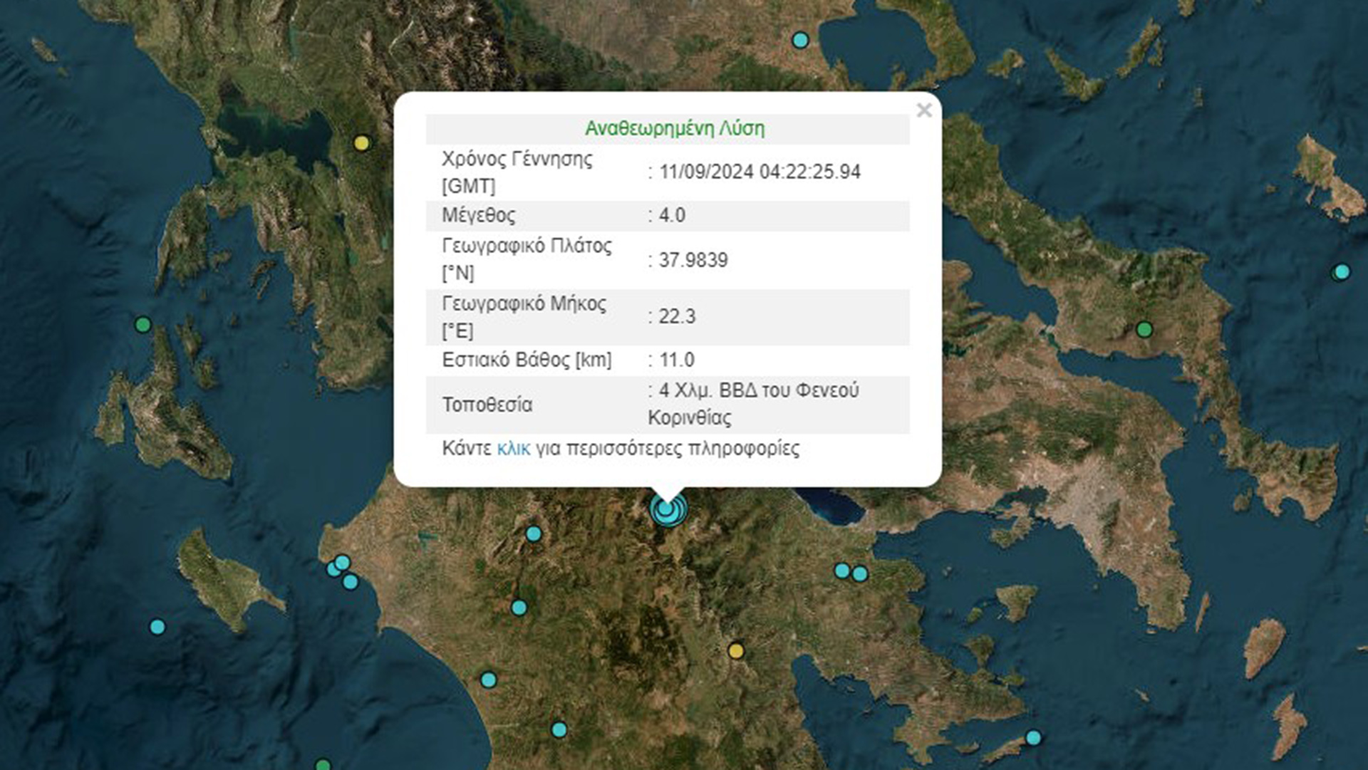 Ειδικότερα, το επίκεντρο του σεισμού, σύμφωνα με το Γεωδυναμικό Ινστιτούτο, εντοπίζεται 4 χιλιόμετρα βόρεια βορειοδυτικά του Φενεού Κορινθίας και είχε εστιακό βάθος 11 χιλιόμετρα.
