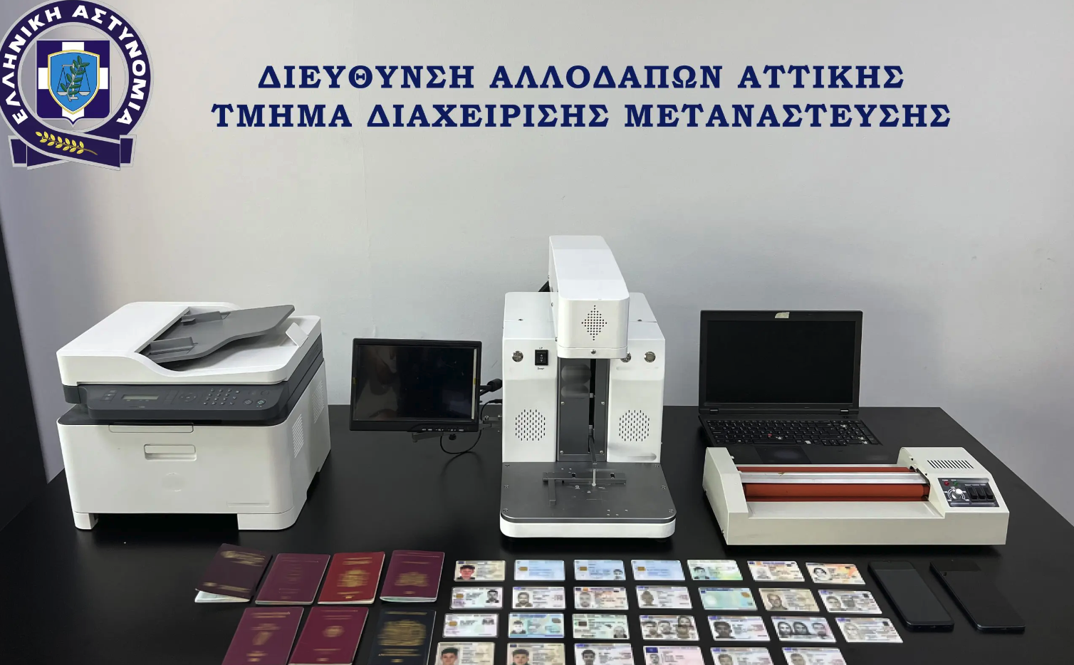 Για τον σκοπό αυτό λειτουργούσε πλήρες εργαστήριο κατάρτισης πλαστών εγγράφων, το οποίο διέθετε εξειδικευμένο επαγγελματικό εξοπλισμό εκτύπωσης και εγχάραξης εγγράφων και πλαστικών καρτών, σύγχρονης τεχνολογίας laser, αλλά και κατάλληλες πρώτες ύλες. Σημειώνεται ότι μεταξύ των κατασχεθέντων βρέθηκε και σύγχρονη, επαγγελματικού τύπου συσκευή εκτύπωσης με τεχνολογία laser, η οποία δεν αποτελεί σύνηθες εύρημα σε κοινά εργαστήρια κατάρτισης πλαστών εγγράφων, καθώς πολλαπλασιάζει τις δυνατότητες κατάρτισης πλαστών εγγράφων τόσο σε ποιοτικά χαρακτηριστικά, όσο και ως προς την «γκάμα» των εγγράφων που δύναται να παραχθούν και ιδίως σε έντυπα νέου τύπου που έχουν τη μορφή πλαστικής κάρτας.