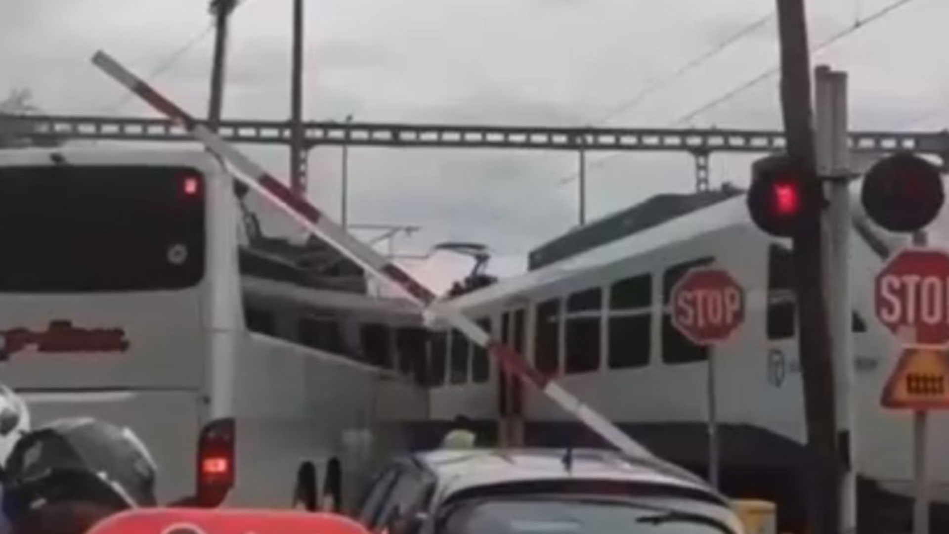 Οπως αποτυπώνεται σε βίντεο, ένα τουριστικό λεωφορείο εγκλωβίστηκε από την μπάρα στη διάβαση και το τρένο που διέσχιζε το σημείο εκείνη τη στιγμή, πέρασε σύρριζα.