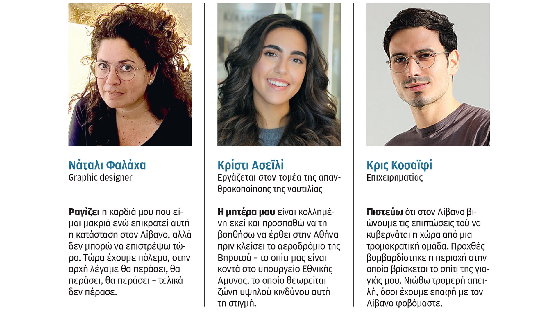 Τόσο η ίδια όσο και άλλοι Λιβανέζοι που ζουν στην Αθήνα και μιλούν σήμερα στην «Κ» έχουν αφήσει πίσω τους οικογένειες και φίλους με τους οποίους είναι σε συνεχή επικοινωνία, προσπαθώντας σε κάποιες περιπτώσεις να τους πείσουν να έρθουν στην Ελλάδα.