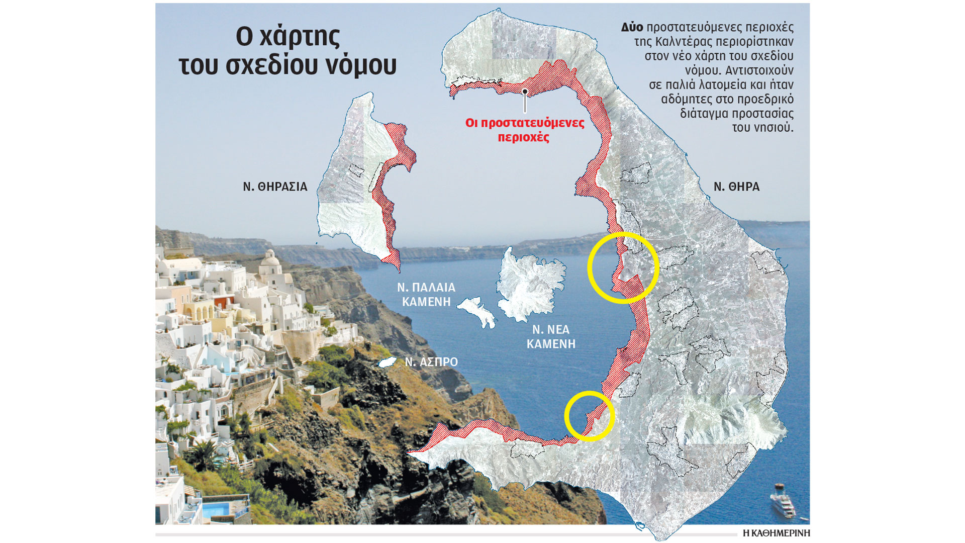 Οπως υποστηρίζουν, σε χάρτη που συνοδεύει ρύθμιση σε σχέδιο νόμου του υπουργείου Περιβάλλοντος, «εξαφανίζονται» από τη ζώνη προστασίας της Καλντέρας δύο περιοχές, οι οποίες αντιστοιχούν σε παλιά λατομεία στο νησί. Οι ζώνες αυτές είναι αδόμητες στο προεδρικό διάταγμα προστασίας του νησιού και συνεπώς η αλλαγή του χάρτη ισοδυναμεί με μια έμμεση αθόρυβη προσπάθεια τροποποίησής του. Η επίμαχη ρύθμιση περιλαμβάνεται σε σχέδιο νόμου του υπουργείου Περιβάλλοντος, με θέμα «Ρυθμίσεις για τον εκσυγχρονισμό της διαχείρισης αποβλήτων, τη βελτίωση του πλαισίου εξοικονόμησης ενέργειας, την ανάπτυξη των έργων ενέργειας και την αντιμετώπιση πολεοδομικών ζητημάτων», που δόθηκε σε διαβούλευση μέχρι τα μέσα Σεπτεμβρίου, αλλά δεν έχει ακόμη κατατεθεί στη Βουλή. Η ρύθμιση αφορά την ευρύτερη ζώνη της Καλντέρας, στην οποία: