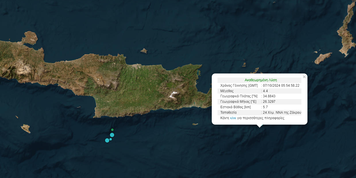 Συγκεκριμένα, σύμφωνα με το Γεωδυναμικό Ινστιτούτο, η σεισμική δόνηση ήταν μεγέθους 4,4 βαθμών της κλίμακας Ρίχτερ και σημειώθηκε στη θαλάσσια περιοχή 24 χλμ. νοτιοανατολικά της Ζάκρου.