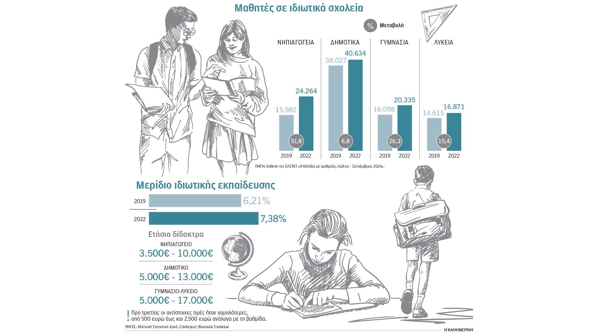 Συγκεκριμένα, στα ιδιωτικά νηπιαγωγεία το 2019 φοιτούσαν 15.982 μαθητές. Τρία χρόνια αργότερα, το 2022, 24.264 μαθητές είχαν επιλέξει ιδιωτικό εκπαιδευτήριο, με την αύξηση να «κλείνει» στο 51,8%. Ταυτόχρονα, στα ιδιωτικά δημοτικά ο αριθμός των μαθητών αυξήθηκε κατά 6,8% (από 38.027 σε 40.634).