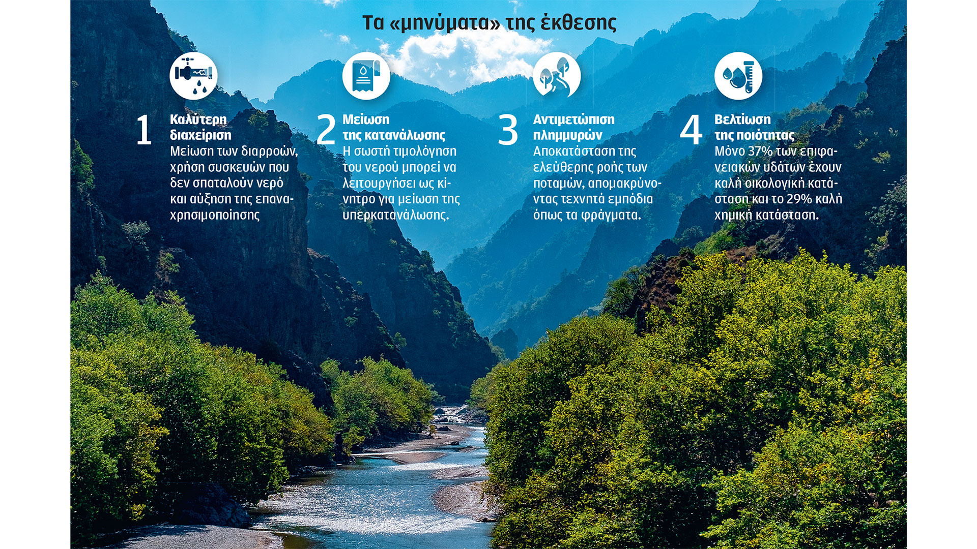Τα στοιχεία αυτά προέρχονται από τη φετινή έκθεση του Ευρωπαϊκού Οργανισμού Περιβάλλοντος (European Environmental Agency) για την κατάσταση των υδάτων στην Ευρώπη. Το κύριο μήνυμα της έκθεσης είναι η επείγουσα ανάγκη για τη βελτίωση της ανθεκτικότητας και για την εξασφάλιση επαρκών αποθεμάτων νερού τόσο για τους ανθρώπους όσο και για το περιβάλλον. Οπως επισημαίνεται: