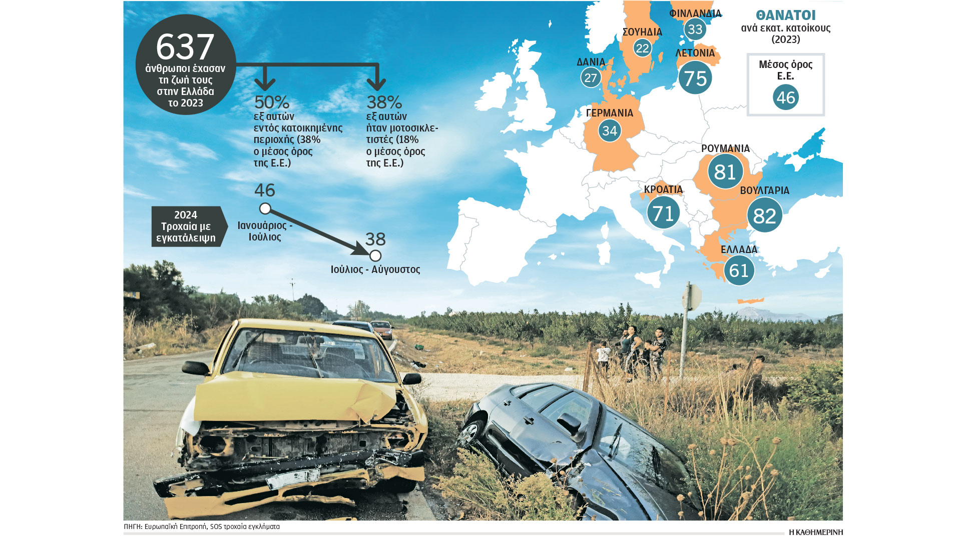 Σύμφωνα με τα τελικά στοιχεία που δημοσίευσε η Ευρωπαϊκή Επιτροπή για τους θανάτους από τροχαία το 2023, η Ελλάδα, παρά τη σημαντική βελτίωση κατά τη δεκαετία 2010-2020, συνεχίζει να πληρώνει βαρύ φόρο αίματος στην άσφαλτο, σημειώνοντας μαζί με την Πορτογαλία την πέμπτη χειρότερη επίδοση μεταξύ των 27 μελών της Ε.Ε. Σε απόλυτα νούμερα, 637 άνθρωποι έχασαν πέρυσι τη ζωή τους στους ελληνικούς δρόμους, ήτοι 53 τον μήνα, σημειώνοντας μικρή πτώση σε σύγκριση με τη χρονιά που προηγήθηκε (-3%) και ακόμη μεγαλύτερη (-7%) σε σχέση με το 2019. Η θέση της χώρας μας εξακολουθεί να είναι απογοητευτική, καθώς το 2023 καταγράφηκαν 61 θάνατοι ανά εκατομμύριο κατοίκων, με την Κροατία (71), τη Λετονία (75), τη Ρουμανία (81) και τη Βουλγαρία (82) να συμπληρώνουν τη «μαύρη» λίστα. Η Ελλάδα καθώς και οι υπόλοιπες χώρες που τη διαδέχονται στη σχετική κατάταξη απέχει σημαντικά από τον αντίστοιχο ευρωπαϊκό μέσο όρο που διαμορφώνεται στους 46 θανάτους ανά εκατομμύριο κατοίκων, υπενθυμίζοντας έτσι πόση απόσταση χρειάζεται να διανύσει για να πετύχει τον στόχο της Ε.Ε. για 0 νεκρούς από τροχαία ατυχήματα έως το 2050 (vision zero). Κάποια προκαταρκτικά στοιχεία της Κομισιόν για το 2024 δείχνουν πως η κατάσταση στους ελληνικούς δρόμους και κατά το πρώτο εξάμηνο είναι περίπου η ίδια. Λιγότερους νεκρούς καταγράφουν για άλλη μία χρονιά η Σουηδία με 22 θανάτους ανά εκατομμύριο κατοίκων, αλλά και η Δανία (27), ενώ καλές επιδόσεις καταγράφουν η Φινλανδία (33 ανά εκατομμύριο) και η Γερμανία (34). Επιπλέον στοιχεία συνθέτουν μια ακόμη πιο δραματική εικόνα για την Ελλάδα. Η χώρα μας παρουσιάζει ένα από τα υψηλότερα ποσοστά νεκρών σε οδικά δυστυχήματα εντός κατοικημένης περιοχής (50% του συνόλου) σε σύγκριση με τον ευρωπαϊκό μέσο όρο που είναι στο 38%, κυρίως λόγω των ατυχημάτων μοτοσικλετιστών. Στην Ελλάδα χάνουν τη ζωή τους περίπου 20 αναβάτες δικύκλων τον μήνα και η χώρα μας καταγράφει ένα ιδιαίτερα υψηλό ποσοστό νεκρών μοτοσικλετιστών (38% του συνόλου), τη στιγμή που ο ευρωπαϊκός μέσος όρος είναι 18%.