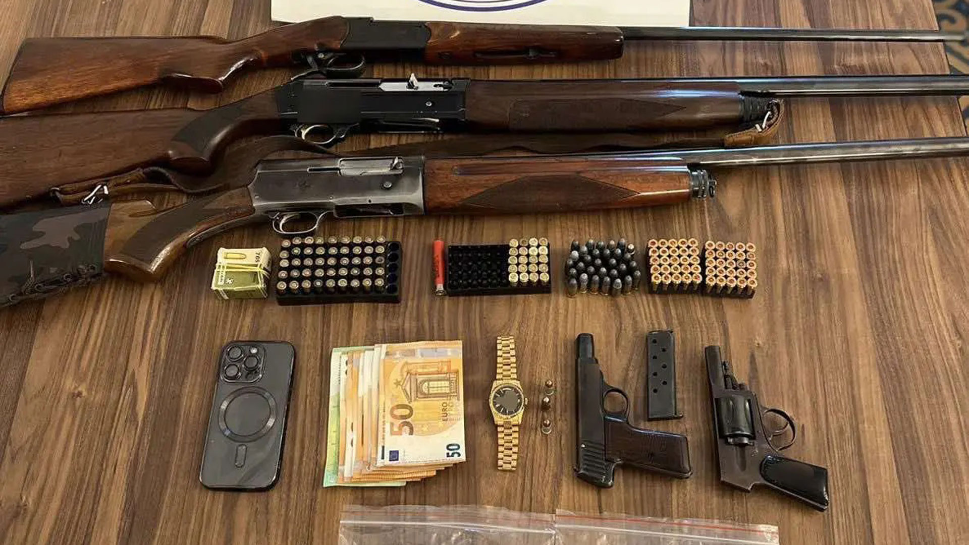 Σε σωματική έρευνα, καθώς και σε έρευνα που πραγματοποιήθηκε σε οικία, βρέθηκαν και κατασχέθηκαν, τρεις κυνηγετικές καραμπίνες, περίστροφο, πιστόλι, 251 φυσίγγια, 500 ευρώ, ρολόι και κινητό τηλέφωνο.