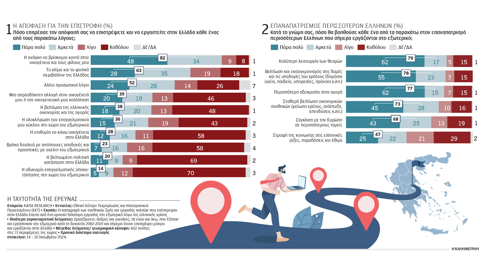 Η «Κ» παρουσιάζει σήμερα αποκλειστικά την πρώτη μεγάλη έρευνα που έχει γίνει και αφορά αυτούς που έχουν πάρει την απόφαση να επιστρέψουν από το εξωτερικό, που σύμφωνα με τα στοιχεία που παρουσίασε η Εurostat τον περασμένο Μάρτιο ανέρχονται σε 350.000. Η έρευνα διεξήχθη το προηγούμενο δεκαπενθήμερο από το Εθνικό Κέντρο Τεκμηρίωσης και ηλεκτρονικού περιεχομένου, το οποίο υπάγεται στον υφυπουργό Ψηφιακής Διακυβέρνησης Κωνσταντίνο Κυρανάκη, ο οποίος πριν εκλεγεί βουλευτής είχε ασχοληθεί με το θέμα ως βασικό μέλος της επιτροπής του brain gain που είχε κάνει εκδήλωση ήδη από το 2016 με θέμα «Θα γύριζα εάν…». H μέτρηση, οκτώ χρόνια μετά, απαντάει στο γιατί γύρισαν και τι θέλουν ακόμη να αλλάξει, προσθέτοντας ένα πολύ σημαντικό εργαλείο στα χέρια της κυβέρνησης, ώστε να συνεχίσει την προσπάθεια αντιστροφής της μεγάλης διαρροής της περασμένης δεκαετίας.