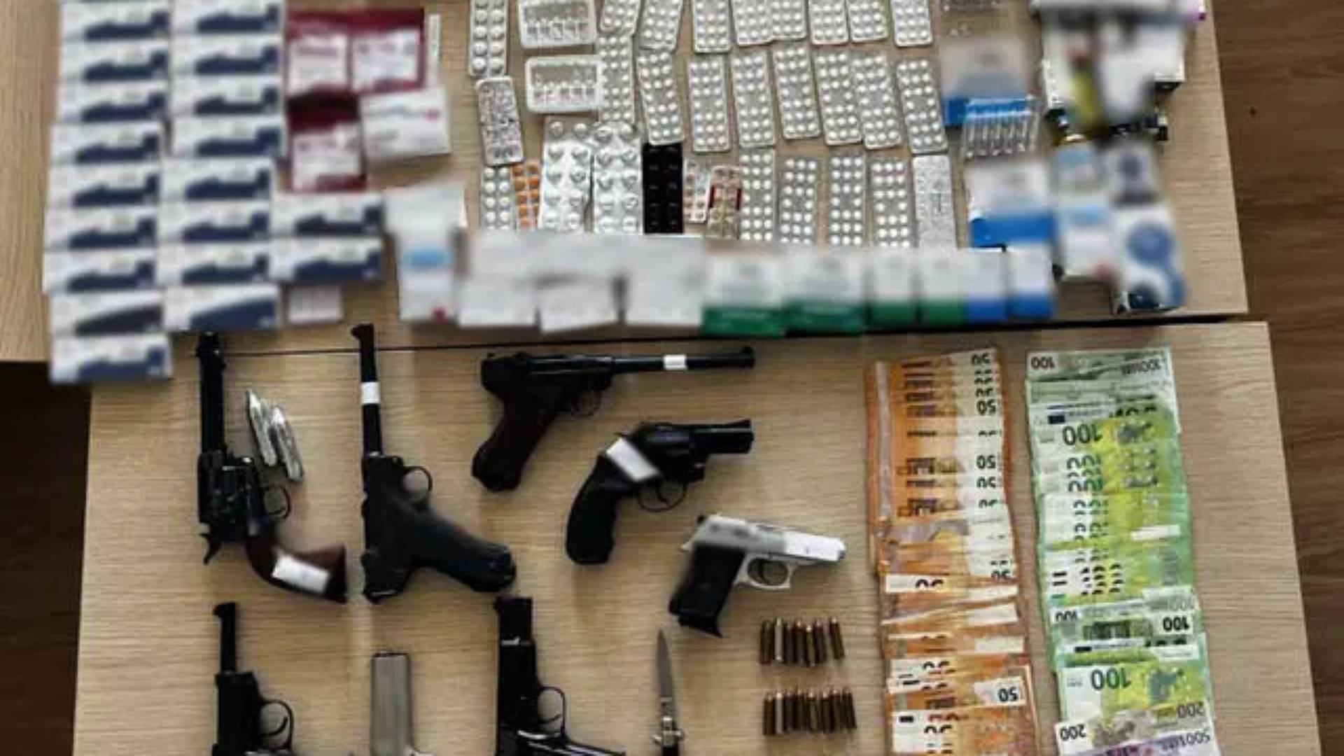 Στην έρευνα, που πραγματοποιήθηκε στο σπίτι του, παρουσία δικαστικού λειτουργού, βρέθηκαν και κατασχέθηκαν 2.083 τεμάχια αναβολικών σκευασμάτων (δισκία, αμπούλες και φιαλίδια), επτά πιστόλια κρότου λάμψης, αεροβόλο περίστροφο με δύο αμπούλες, 30 φυσίγγια πυροβόλου όπλου, διαφόρων διαμετρημάτων, μαχαίρι-στιλέτο, δύο κινητά τηλέφωνα, ιδιόχειρες σημειώσεις και 9.250 ευρώ.