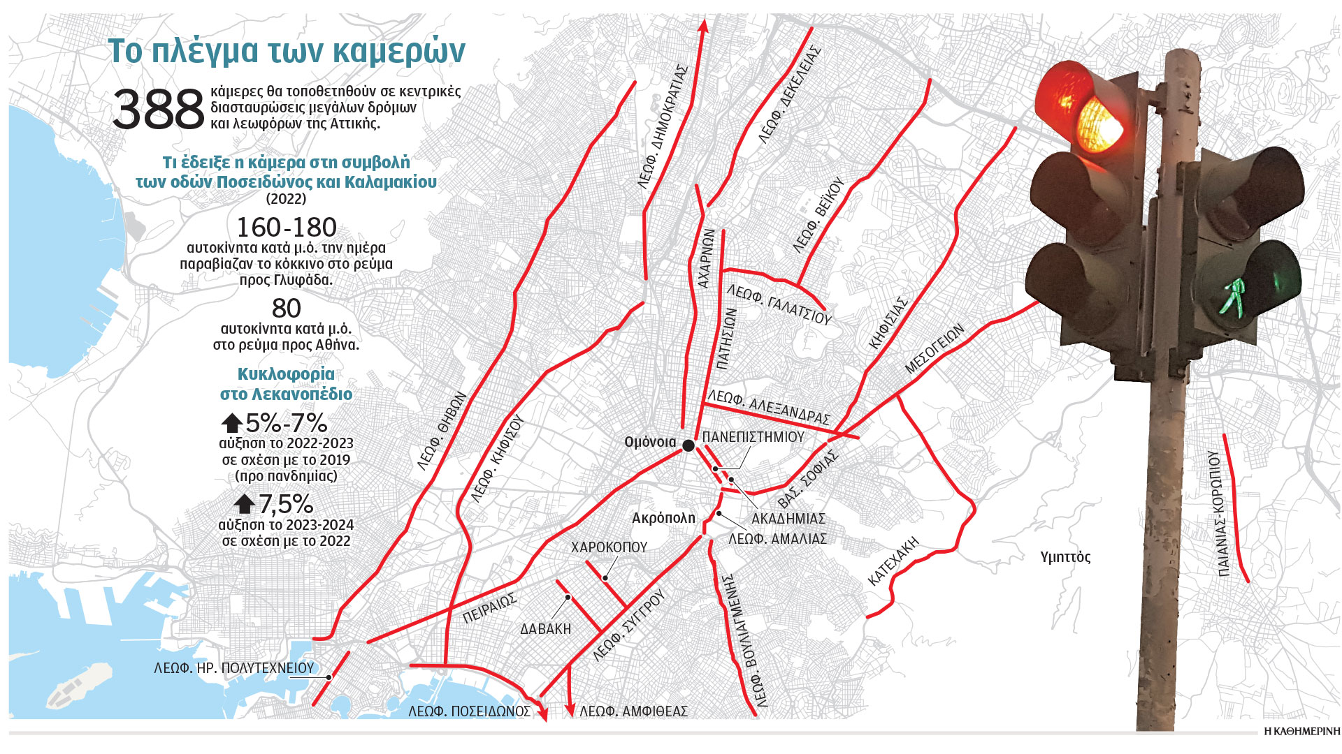 Συνολικά 388 κάμερες θα τοποθετηθούν σε διασταυρώσεις κεντρικών δρόμων στην Αττική με στόχο την καταγραφή των παραβιάσεων του ερυθρού σηματοδότη από τα διερχόμενα αυτοκίνητα. Η εγκατάσταση των συγκεκριμένων καμερών θα πραγματοποιηθεί σε εφαρμογή σύμβασης που αναμένεται να υπογράψει η Περιφέρεια Αττικής τις επόμενες ημέρες με τους ανάδοχους εταιρείας που αναδείχτηκε από ανοικτό ηλεκτρονικό διαγωνισμό. Το κόστος της προμήθειας, εγκατάστασης και συντήρησης των καμερών που θα λειτουργούν ως συσκευές καταγραφής των παραβάσεων του κώδικα οδικής κυκλοφορίας, προβλέπεται να φτάσει στα 18,8 εκατ. ευρώ και οι πόροι θα καλυφθούν από το Ταμείο Ανάκαμψης και Ανθεκτικότητας. Οι κάμερες θα εγκατασταθούν σταδιακά μέσα στον επόμενο ενάμιση χρόνο.