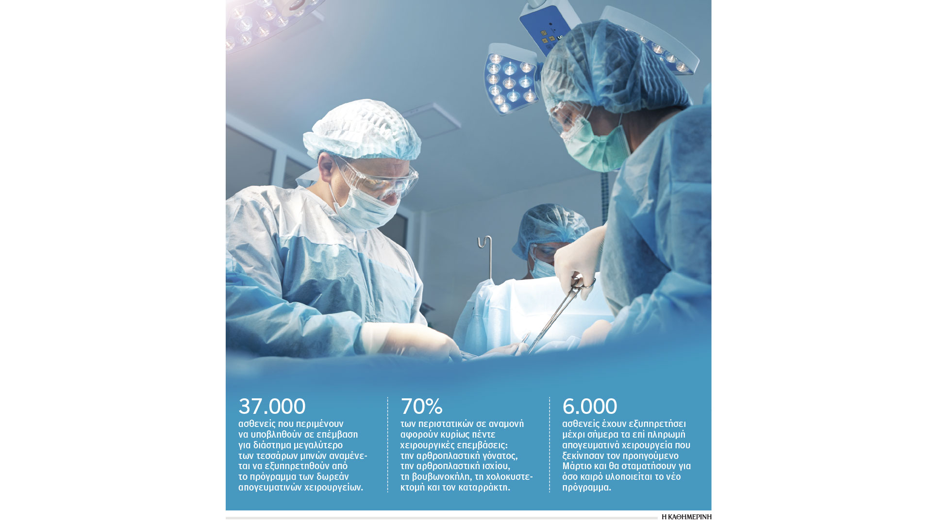 Με στόχο να βελτιωθούν οι χρόνοι αναμονής για χειρουργικές επεμβάσεις στη χώρα μας ξεκινάει στις 28 Νοεμβρίου το πρόγραμμα των δωρεάν απογευματινών χειρουργείων. Από το πρόγραμμα, το οποίο χρηματοδοτείται με πόρους του Ταμείου Ανάκαμψης και Ανθεκτικότητας, εκτιμάται –όπως ανακοίνωσε από τη Βουλή ο πρωθυπουργός Κυριάκος Μητσοτάκης– ότι θα ωφεληθούν έως και 37.000 ασθενείς που περιμένουν να υποβληθούν σε χειρουργείο για διάστημα μεγαλύτερο των τεσσάρων μηνών.