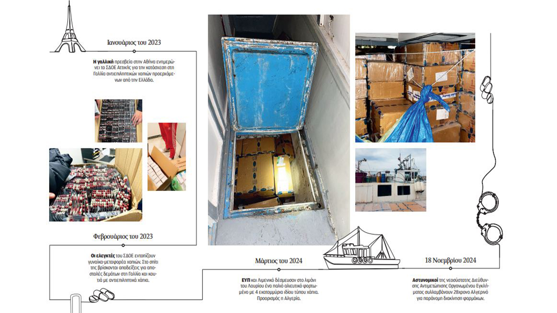 Το μεσημέρι της 18ης Νοεμβρίου, αστυνομικοί της νεοσύστατης Διεύθυνσης Αντιμετώπισης Οργανωμένου Εγκλήματος συνέλαβαν έξω από κατάστημα ταχυμεταφορών στην οδό Πατησίων τον 28χρονο Αλγερινό Mohamed F.., για παράνομη διακίνηση φαρμάκων από την Ελλάδα στη Γαλλία. Μ’ αυτόν τον τρόπο έκλεισε μια έρευνα που είχε ξεκινήσει σχεδόν δύο χρόνια νωρίτερα, τον Ιανουάριο του 2023, από το ΣΔΟΕ Αττικής σε συνεργασία με τις γαλλικές διωκτικές αρχές. Αντικείμενο αυτής ήταν η μαζική, παράνομη εξαγωγή αντιεπιληπτικών χαπιών από φαρμακεία της Αθήνας προς το Παρίσι και άλλες πόλεις της Γαλλίας, όπου τα σκευάσματα καταναλώνονται ως ναρκωτικές ουσίες. Στο ενδιάμεσο, τον Μάρτιο του 2024, ΕΥΠ και Λιμενικό δέσμευσαν στο λιμάνι του Λαυρίου ένα παλιό αλιευτικό με Αιγύπτιους ναυτικούς, που ήταν φορτωμένο με 4 εκατομμύρια ιδίου τύπου αντιεπιληπτικά χάπια και είχε ως προορισμό του την Αλγερία. Οσα συνέβησαν τους τελευταίους 22 μήνες, διάστημα που διήρκεσε το κυνηγητό για το κύκλωμα της πρεγκαμπαλίνης, όπως ονομάζεται η δραστική ουσία των σκευασμάτων, κατέγραψε και φέρνει στο φως της δημοσιότητας η «Κ».