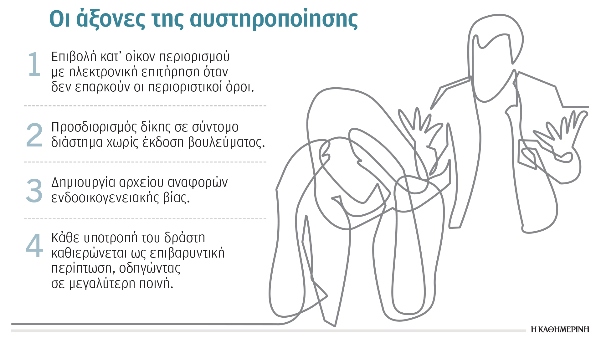 Σύμφωνα με την προωθούμενη διάταξη, «στα κακουργήματα, και σε όσα πλημμελήματα ενδοοικογενειακής βίας προβλέπεται ποινή φυλάκισης τουλάχιστον ενός έτους, επιβάλλεται σε εξαιρετικές περιπτώσεις, εφόσον κριθεί αιτιολογημένα ότι δεν επαρκούν οι περιοριστικοί όροι, κατ’ οίκον περιορισμός με ηλεκτρονική επιτήρηση ή, εφόσον κριθεί αιτιολογημένα ότι δεν επαρκεί ούτε αυτός, προσωρινή κράτηση». Στα πλημμελήματα το ανώτατο όριο τέτοιου είδους μέτρων είναι διάρκειας έως έξι μήνες, χωρίς δυνατότητα παράτασης και με ενδιάμεσο έλεγχο της διάρκειας αυτών στους τρεις μήνες.