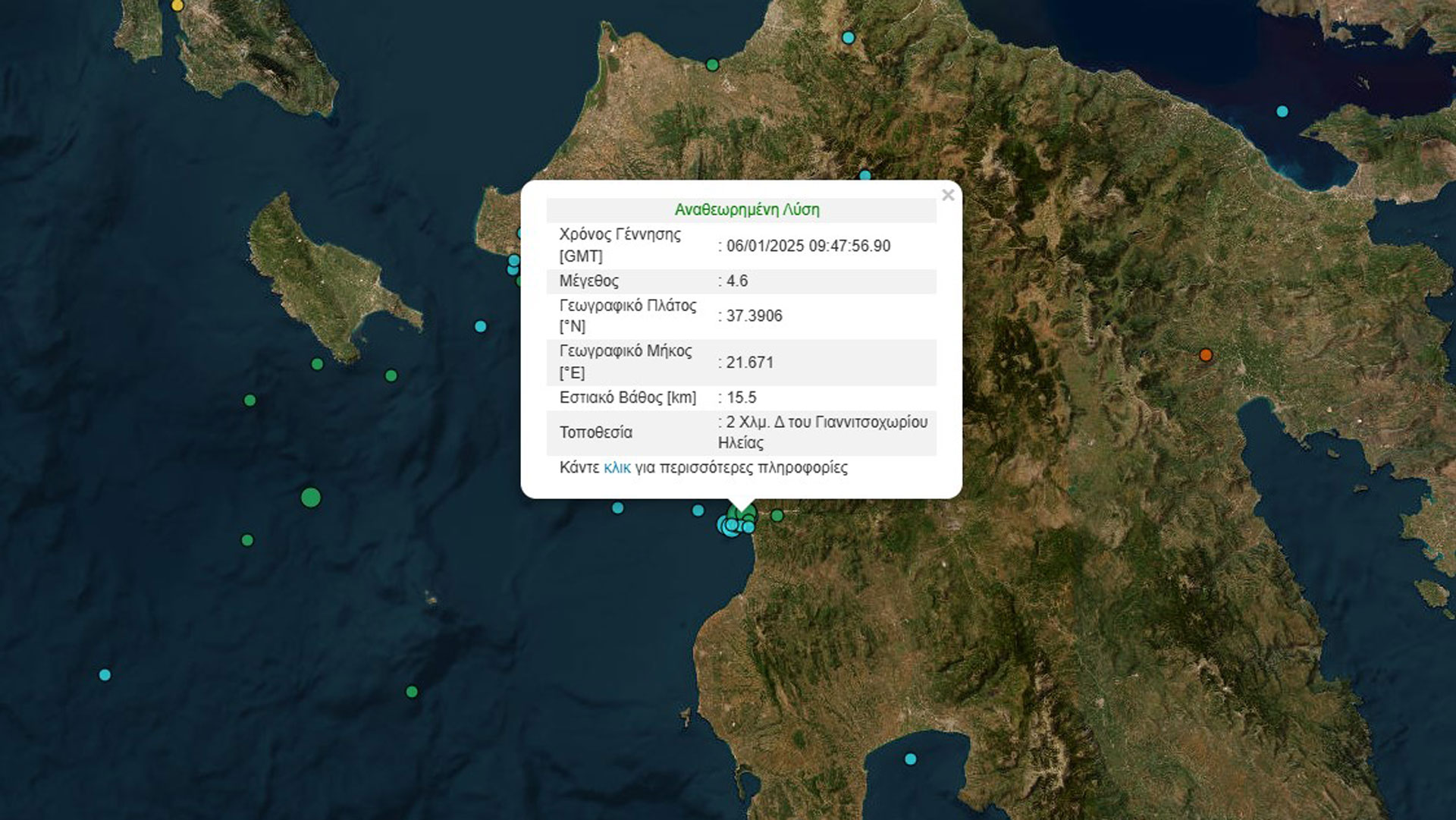 Σεισμική δόνηση έγινε αισθητή στις 11:47 το πρωί της Δευτέρας, σε περιοχές της Ηλείας και της Μεσσηνίας.