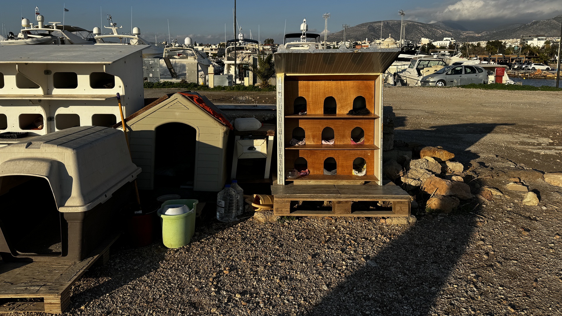 «Είναι ένα μικρό χωριουδάκι για αδέσποτες γάτες. Εγώ έφτιαξα σε μαραγκό ένα από τα πολυώροφα γατόσπιτα που υπάρχουν εδώ και καθημερινά μαζί με άλλα τέσσερα άτομα φροντίζουμε τις γάτες. Κάποιοι τα ταΐζουμε, κάποιοι άλλοι καθαρίζουν, ενώ τα περισσότερα τα έχουμε πάει και για στείρωση. Καθημερινά ασχολούμαι με τις συγκεκριμένες γάτες, εδώ και τρία χρόνια», εξηγεί ο Δημήτρης και τονίζει πως, «όλοι έχουν τους ρόλους τους, εγώ φέρνω την ξηρά τροφή, μία κυρία έρχεται και με την σφουγγαρίστρα καθαρίζει όλες τις φωλιές μία μία, οι ψαράδες τις φέρνουν ψαράκια και τις ταΐζουν και ένας ακόμα κύριος φέρνει τις κονσέρβες».